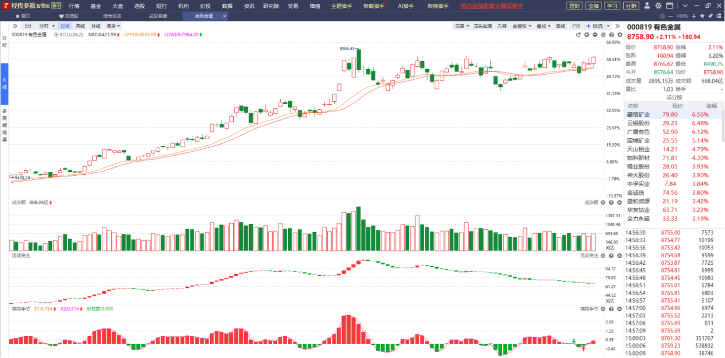 有色金属近期的表现非常不错,K线站在智能辅助线上方,流动资金开始翻红,捕捞季节收出金叉,成交量也保持得不错,不管是应对这个震荡的市场,它作为偏防守的方向,还是涨价逻辑的支撑都对它产生不错的推动,后续可继续关注它的走势。