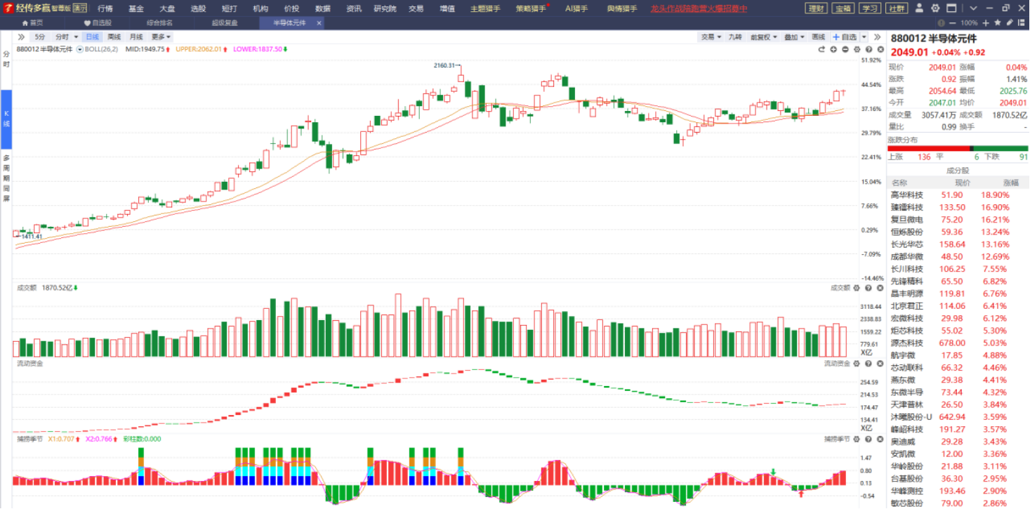 半导体近期的走势很好,不过由于它连续的上涨导致它在相对高的位置收出了一颗十字星,意味着趋势即将发生改变,要么是继续上涨要么是向下调整,对于已经持有相关板块的个股投资者而言继续拿着就行了,对于还没入场的投资者而言可以等趋势明朗一些再做下一步动作。