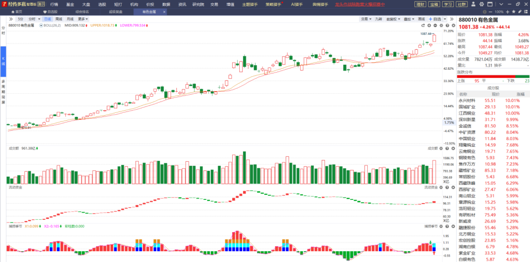 有色近期的走势非常不错,沿着智能辅助线震荡上涨,更是在上周五收出一根大阳线并创出历史新高,成交量收出巨量,流动资金翻红,但是捕捞季节收出光头彩柱,有仓位的继续拿着就行了,它作为防守方向是不错的布局方向,对于想介入的可以等它调整时积极买入。