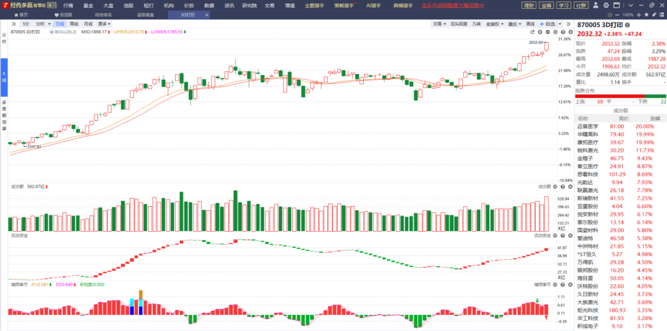 商业航天走势很强已经成为“世人皆知”的事了,但是很多人可能只会盯着商业航天却忽视了与它配套的行业3D打印,没想到在这波商业航天带领下3D打印也走出非常强势的上涨行情,随着时间的推移商业航天的上涨空间越来越小,但该方向的行情才刚刚启动,后续有可能会出现资金高切低的情况,倒是可以适当关注一下。