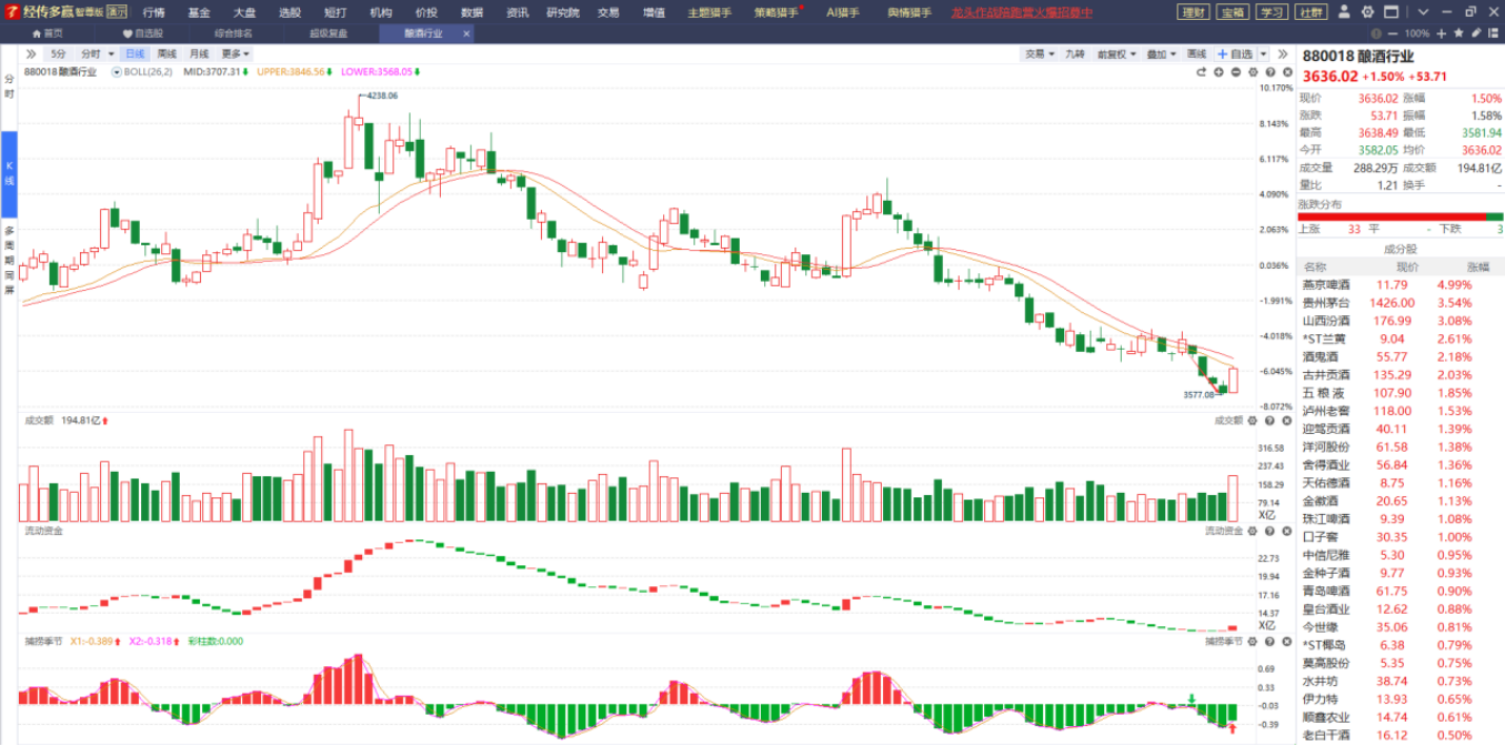 现在的酿酒板块一点“老大哥”的样子都没有了,不管市场是震荡上涨还是震荡下跌,它都能脱离市场的走势,走出一条属于自己的路,就在沪指收出“十二连阳”的壮举时,酿酒板块居然还创出了阶段新低,跟这市场的走势格格不入,现在说到酿酒板块就只剩下估值低这一个优势了,针对它的看法跟之前一样,感兴趣的留个底仓参与一下,别指望它有太强的上涨行情。