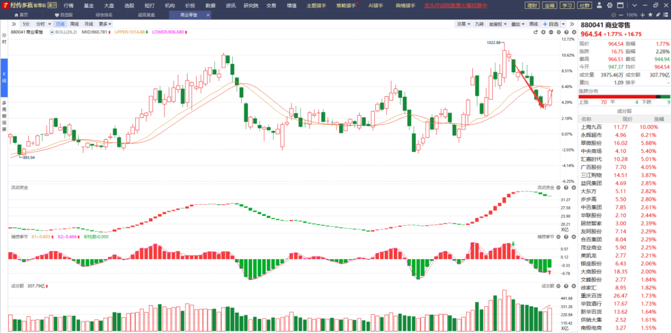 商业零售昨天的反弹力度很强,不过它目前依然面临着辅助线的压制,鉴于它所处的位置比较低,一旦突破辅助线的压制将会迎来不错的补涨反弹行情,感兴趣的继续保持关注即可。
