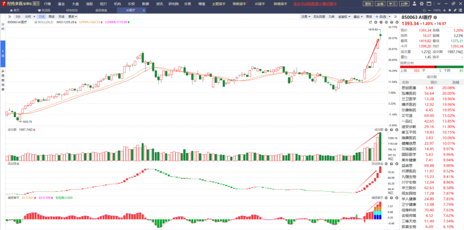 AI医疗近期的走势非常强,而且它的走势也是晚于商业航天的,如果说商业航天已经是“日落西山”了,那么AI医疗就像是一个刚出生的“太阳”一般“朝气蓬勃”,它未来上涨的空间还是比较大的,可是比较可惜的是市场昨天整体调整了,也无法确定这种调整是否会持续,仓位不重地继续持股待涨吧!