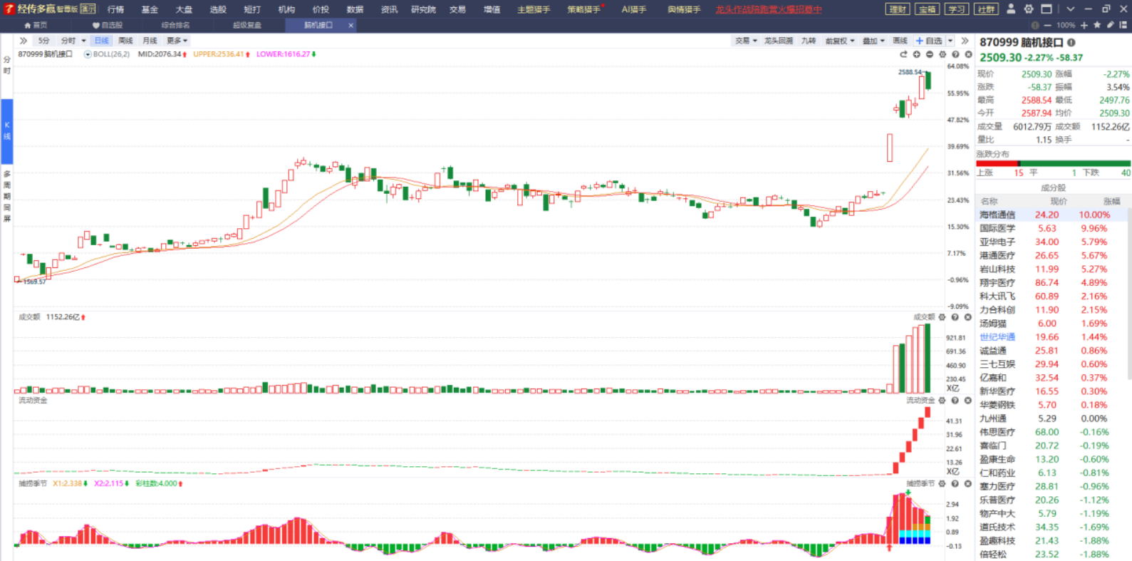 脑机接口的走势也非常不错,但它前期连续跳空高开的缺口如果一把“利剑”悬在大家头顶,市场前期是因为做多热情比较高亢,导致资金被迫做多,如果后面市场真的进入调整周期,那么前面欠的账会不会“秋后算账”?仓位比较重的可以先落到为安一部分,毕竟这波连续的上涨已经让早期持有的人赚得“盆满钵满”,不要妄想着把全部利润都给吃掉。