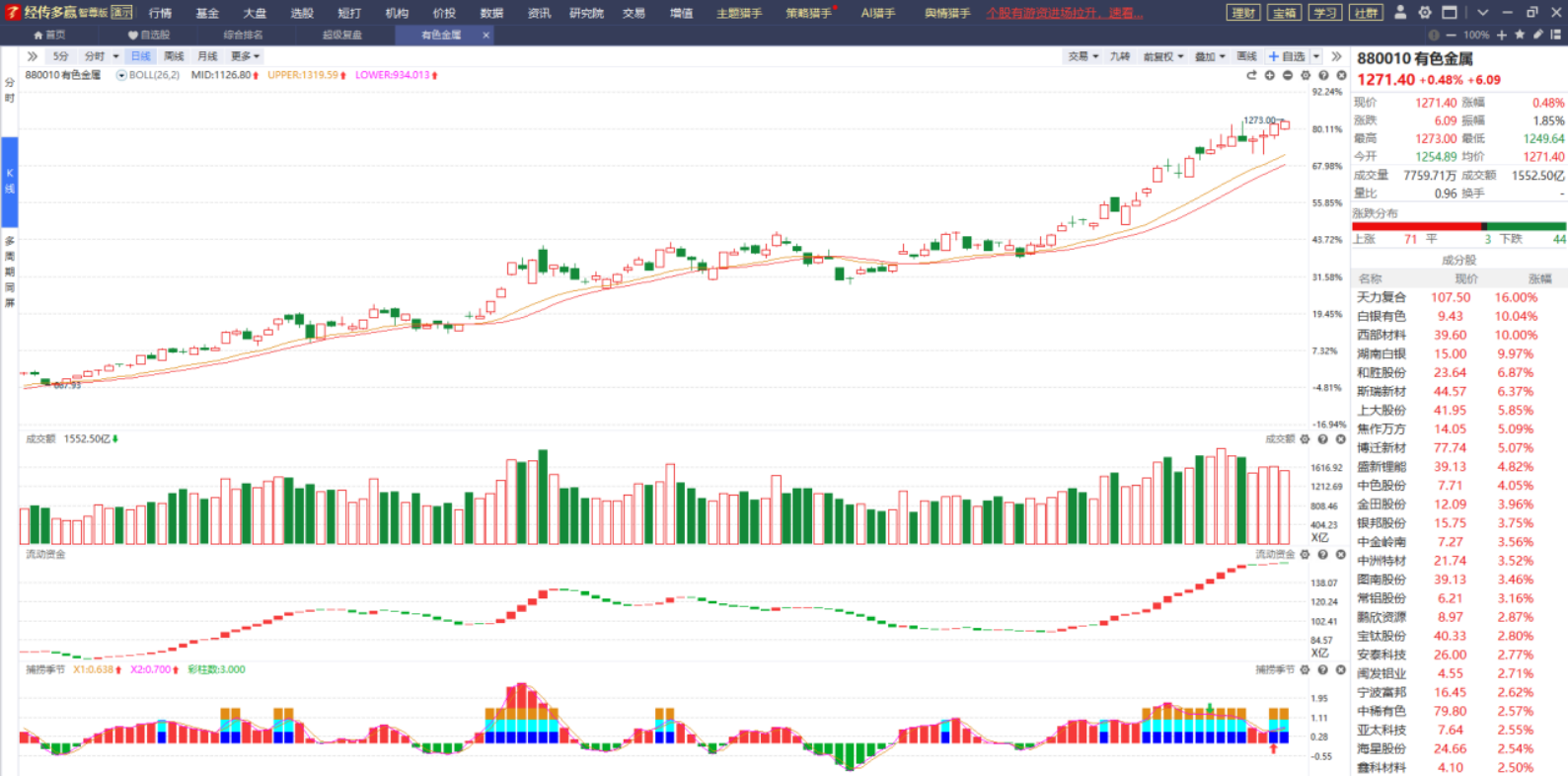 有色金属近期的走势非常不错,不过它的成交量开始呈缩量状态,流动资金也开始翻绿,捕捞季节虽然收出了金叉但却是光头彩柱,是否意味着这种强势的状态即将发生转变?仓位不重的继续保持观察,然后再做决策,毕竟现在的时候整体处于震荡走势,什么板块都有可能诞生出上涨行情。