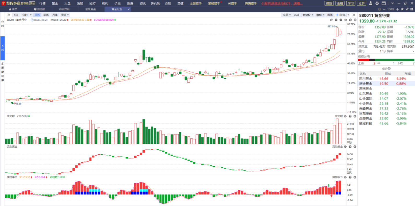 黄金板块近期受外围局势的动荡以及市场震荡调整的影响都走出非常不错的上涨行情,可是也正是因为市场的动荡导致资金不敢过于去追前期涨幅过大的板块,而它昨天的大幅下跌是否就意味着调整即将开始?对该方向感兴趣的不妨耐心等待它回档金叉出现后再做打算。