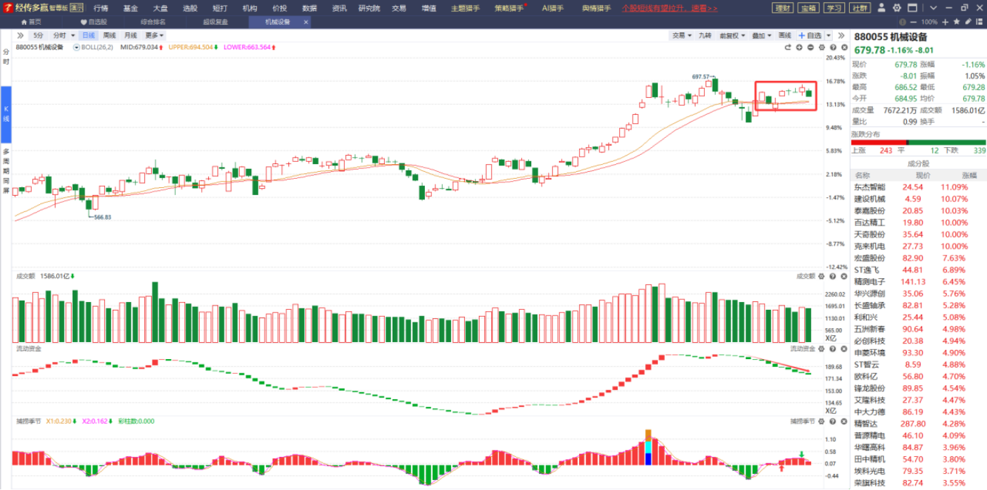 脑机接口概念在智能辅助线的“生死边缘”进行徘徊,从目前各项指标来看形势并不是很乐观,成交量没有明显的放量,流动资金持续翻绿,后续需要耐心留意它能否在辅助线得到支撑,若能则可以持续关注,若跌破支撑则无须留意。