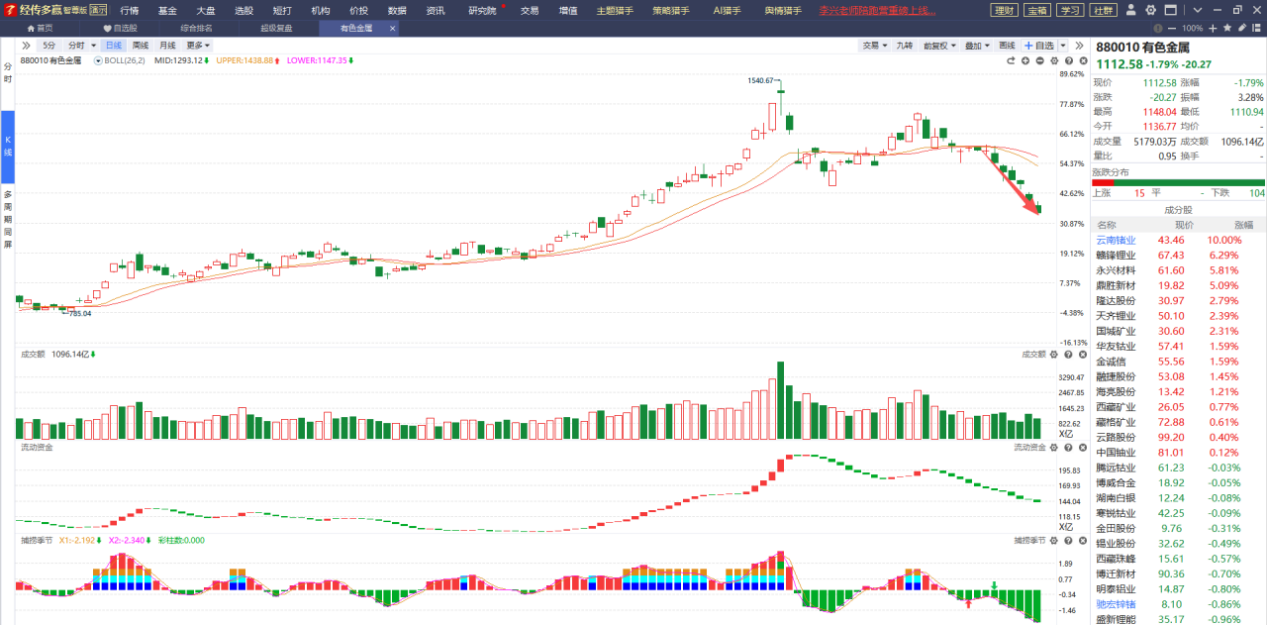 在市场震荡的这段时间,有色金属走出了持续下跌行情,已经把前期的涨势给跌回去了,如果此时逢调整低吸入场,一旦市场后续展开反弹行情,那它有可能迎来较大的修复上涨行情。