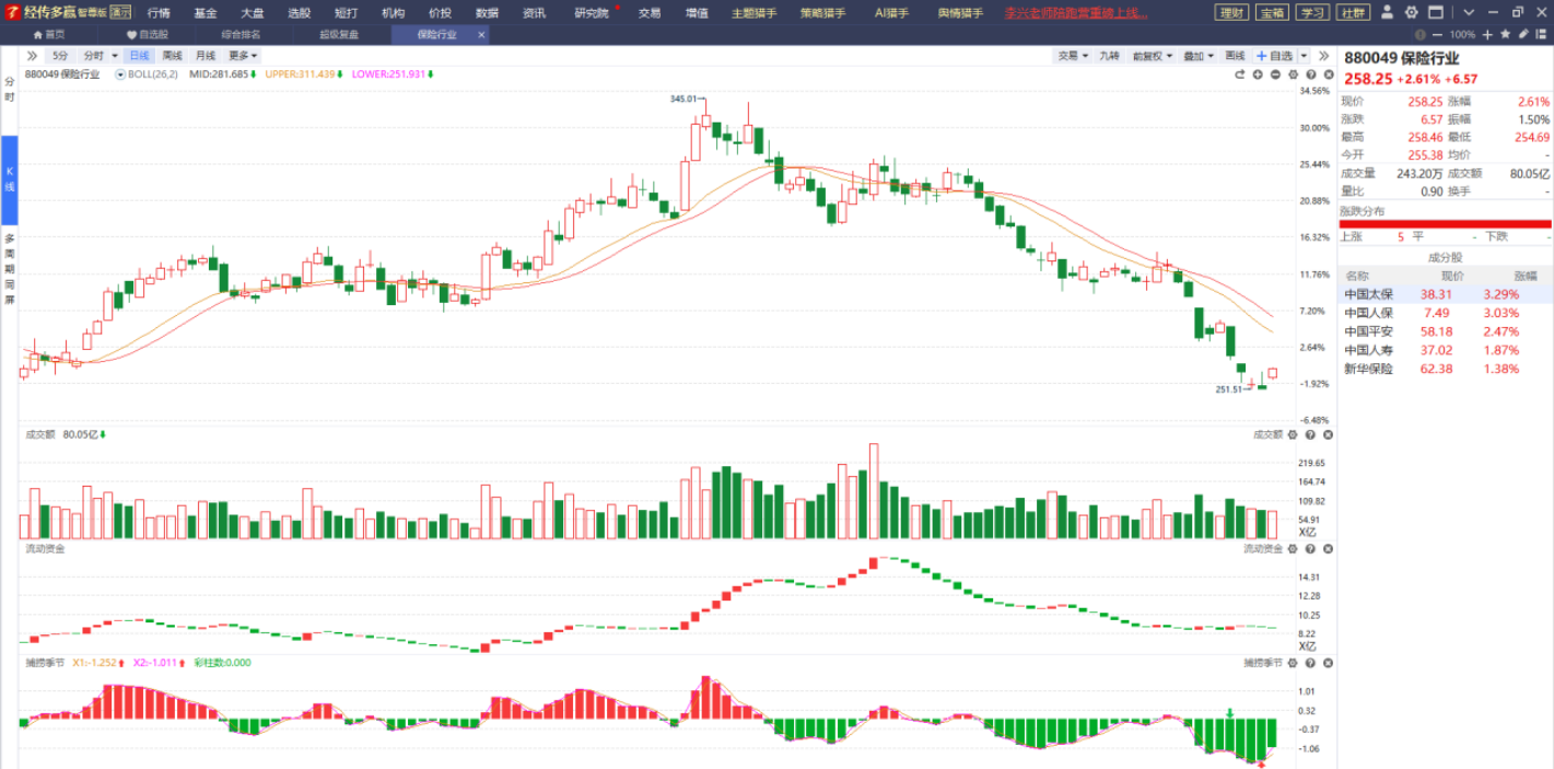 前几日在市场处于大幅调整行情时以银行为首的权重金融股展开了较为不错的反弹行情,从而带动保险板块走出了止跌企稳反弹的走势,这是看好它后续有可能上涨的原因,另一个重要的原因就是它经历了较大幅度的调整,目前已经收出阶段新低,如果是一些偏谨慎的投资者,对未来走势感到担忧的,可以分出一部分仓位布局这些偏防守的方向。
