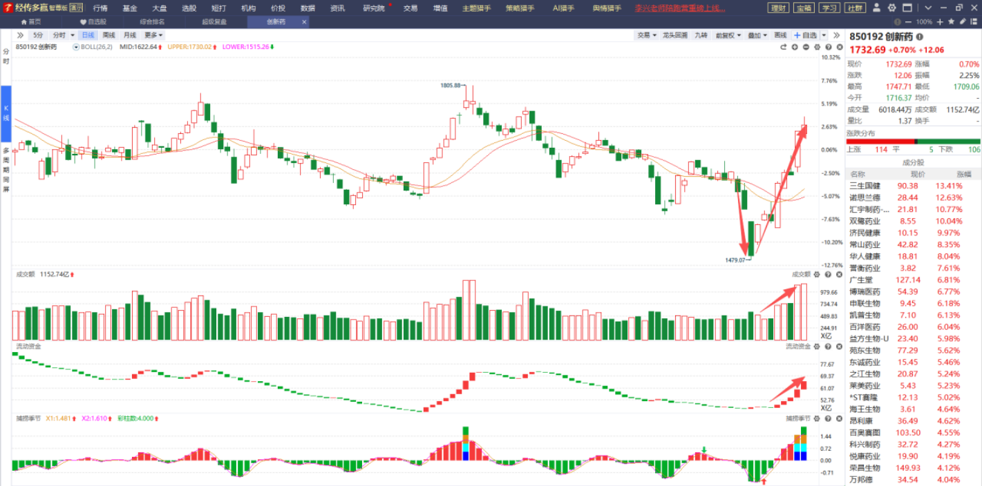 创新药的这一波超跌反弹力度很强,已经让一部分人蠢蠢欲动了,不过这里奉劝一些还想追涨的人“三思而后行”,它在市场整体处于震荡行情中走出了独立行情,而且力度空前的强势,但越是强势越容易走出调整行情,真想参与可耐心等待调整时介入,而对于已经在车上的投资者而言,仓位重的后续它越涨则越要逐步降低仓位。