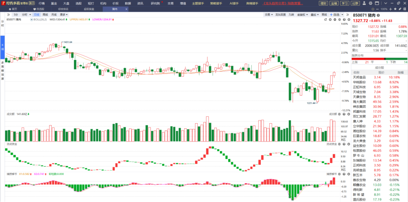 猪肉板块自从突破辅助线压制之后的走势非常不错,而各项指标也表现得非常积极且越来越好,持续有相关个股且仓位不重的继续持股待涨即可。