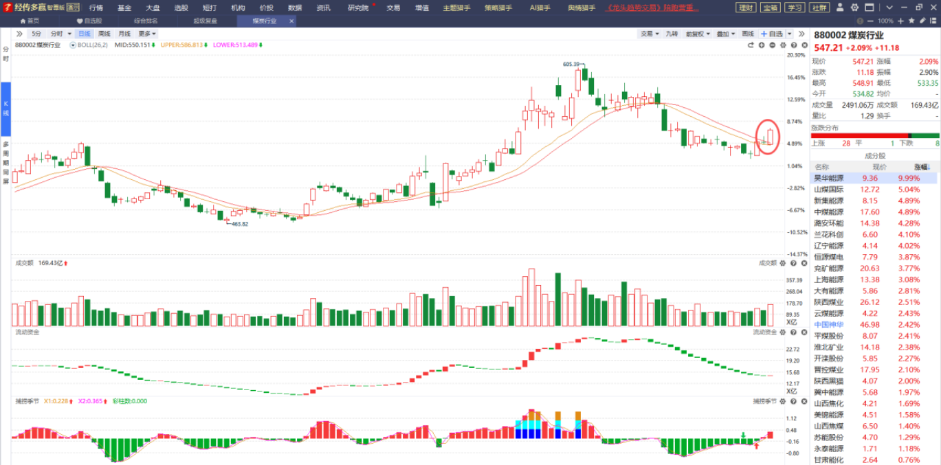 煤炭板块在昨天科技方向集体走弱时,迎来了资金的扎堆抱团,收出一根放量大阳线,而且从其他各项指标来看,流动资金翻红,捕捞季节收出金叉,是趋势由弱转强的初期阶段,对该方向感兴趣的可轻仓参与一下,之所以轻仓是因为市场的主线还是科技方向,而这些只能作为防守方向,在科技方向调整时在资金高切低时它们会有所异动。