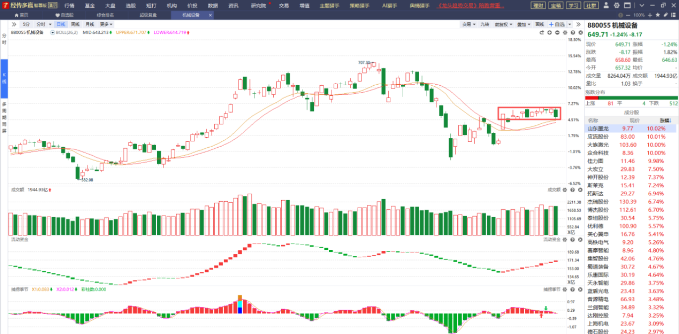 机械设备板块近期一直在智能辅助线上方窄幅横盘震荡,趋势中规中矩,没有特别强也没有特别弱,只要它没有跌破辅助线支撑就可以轻仓持有,俗话说“横有多长竖有多高”,它这种长时间的横盘震荡还不破位,肯定是有主力在底部不断的吸筹,一旦时机成熟会爆发出一轮比较大的上涨行情,可以拿出一部分闲置的仓位布局一下。