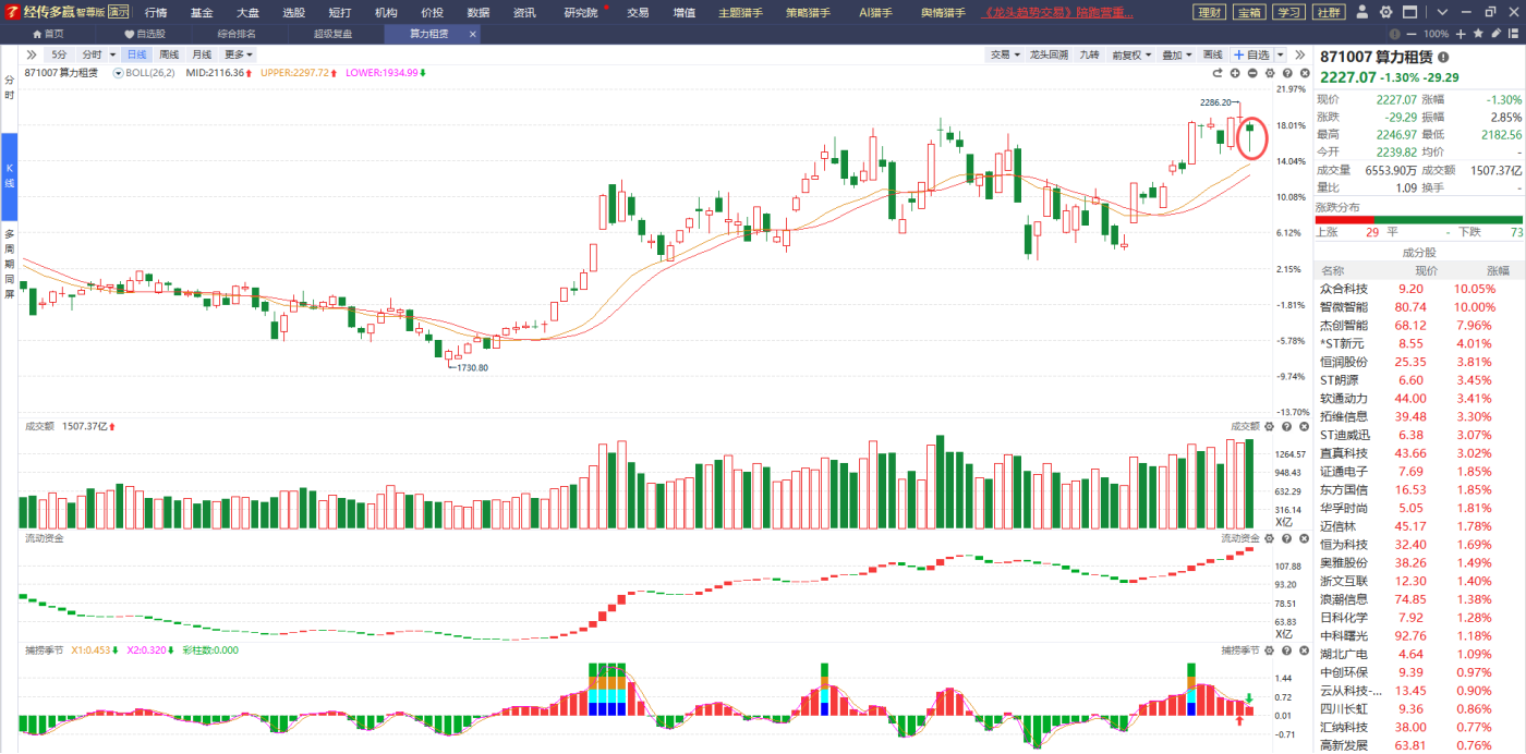 算力租赁近期的波动比较大,上周四收出高位十字星,上周五又收出金针探底形态,算力方向未来的潜力比较大,可以在调整时积极介入。