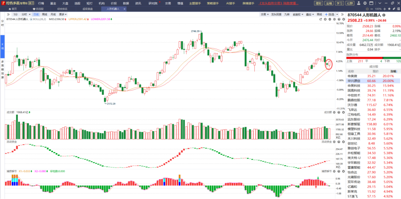 人形机器人板块在昨天科技方向的带领之下,迎来了较大的反包行情且刚好在辅助线上方企稳,目前指标方面不是很强但趋势还保持得不错,只要不破位就可以逢调整时积极介入。