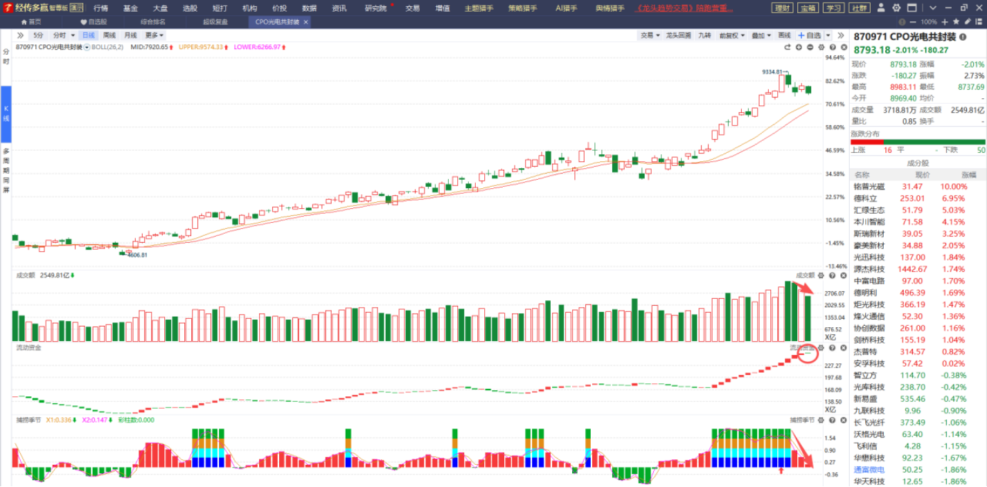CPO概念昨天跌幅较大,成交额呈持续缩量状态,流动资金翻绿,捕捞季节收出金叉,从指标方面来看,后续下跌的概率比较大,对该方向感兴趣的可以关注后续回档金叉回踩辅助线的投资机会。
