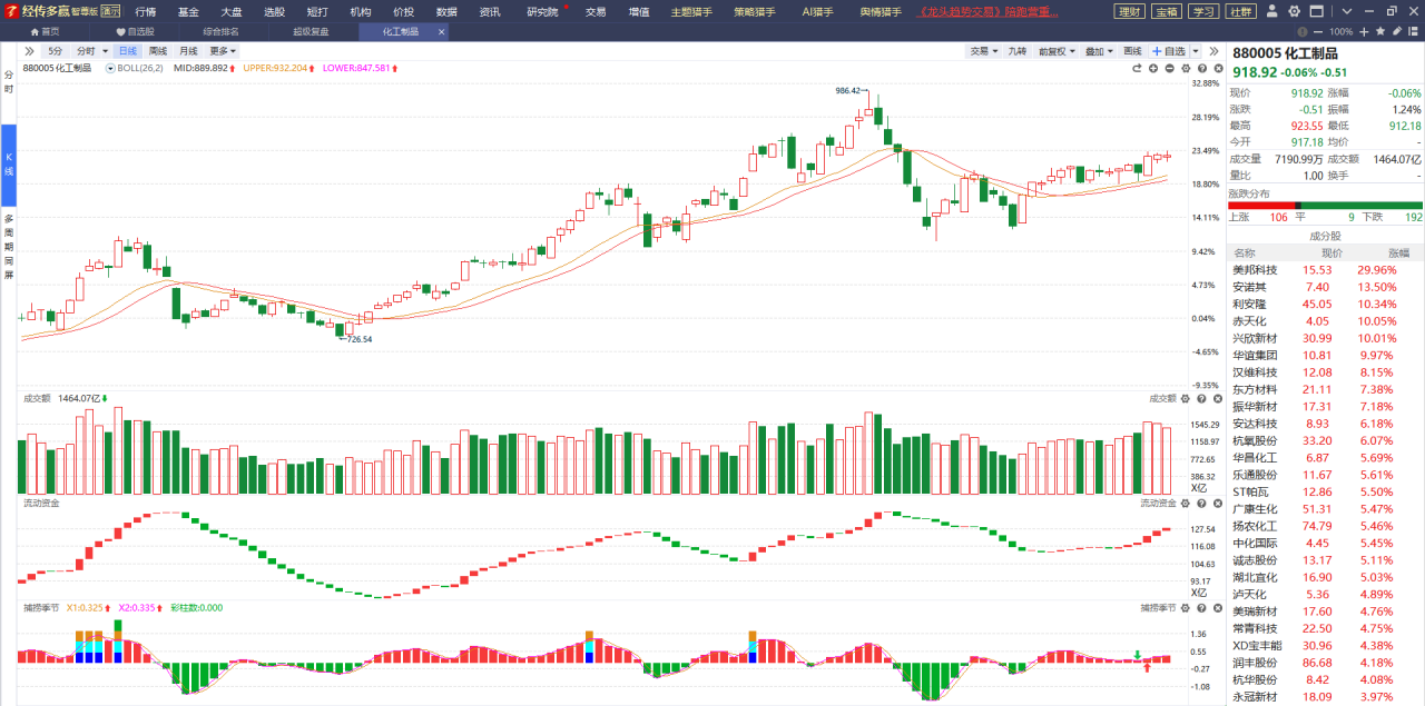 化工板块自从上周五收出一根反包大阳线之后就一直在辅助线上方窄幅震荡,虽然涨幅不大但能在市场震荡调整时还能保持翻红状态以及实属不易,目前指标方面还不错,持有相关个股的继续持股待涨即可。