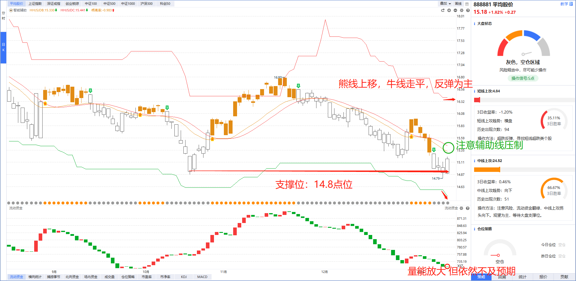 从软件指标来看,平均股价已经在支撑位附近触发反弹,市场量能有所放大但依然不足(7000亿不足以支撑后续反弹),当前熊线上移+牛线走平说明现阶段超跌反弹为主,但受智能辅助线压制,所以反弹空间不大,注意在被智能辅助线压制的时候及时减仓。