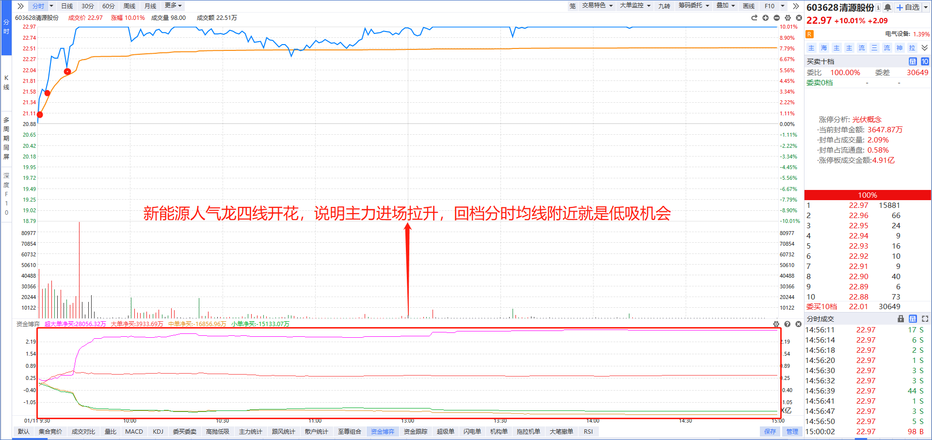 根据“事不过三”的原则,新能源赛道终于在“第三次”成功带领市场反弹。其实前几次的新能源权重表现得比较亮眼,但是缺了“清源股份”这个核心阵眼,所以“引领情绪”的效果就大打折扣,而今天主力敢在高位拉升“清源股份”,因此给了其余短线资金很大信心,明天只要清源股份稳在分时均线上(最好出现四线开花),那么新能源赛道将有望继续走强。