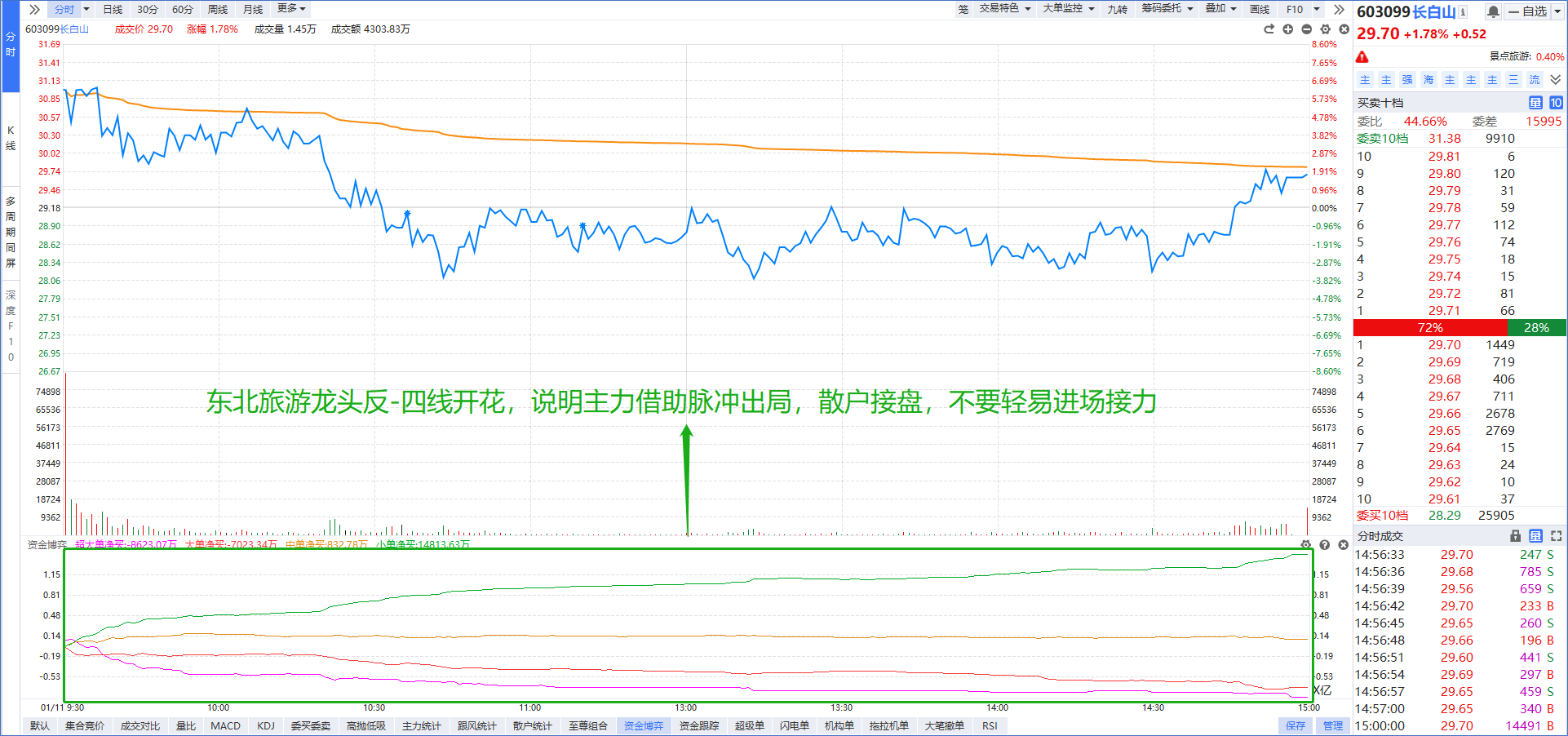昨天提到了,“清源股份”和“长白山”的世纪PK,早盘长白山直接出现“反-四线开花”,说明主力不断出货,因此前期发酵的东北消费个股跑输市场。