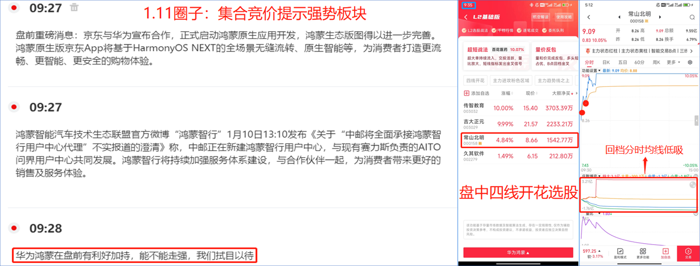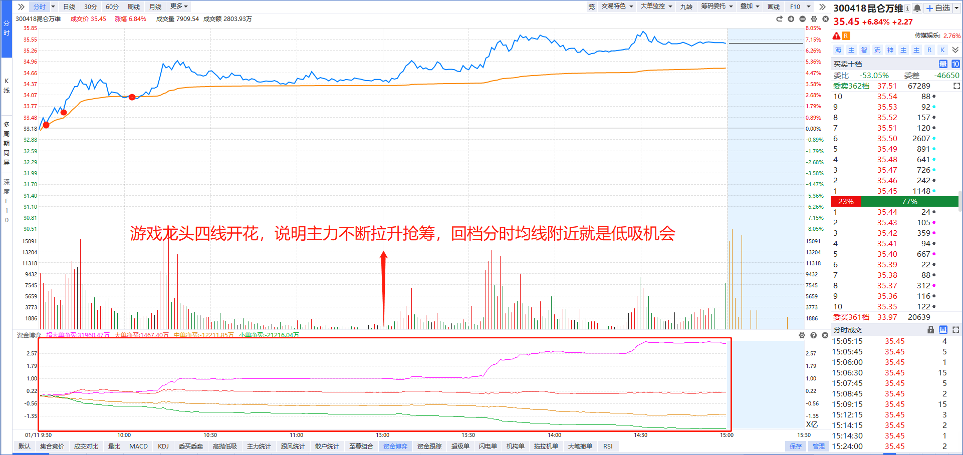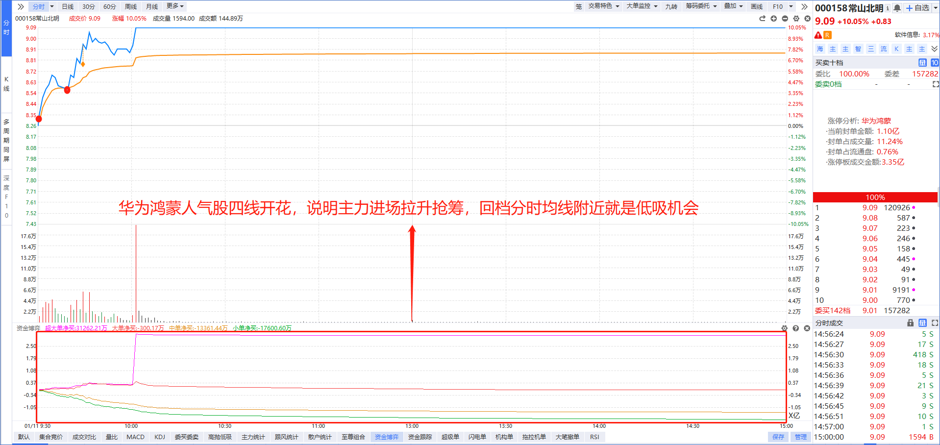 集合竞价阶段,老师就在圈子里面说了“华为鸿蒙”在利好刺激下有望迎来走强,哪怕在9:35分阶段没有使用“L2基础版”抓到传智教育和吉大正元,但是最核心的常山北明应该能斩于马下的,恭喜各位赚钱的用户朋友们!