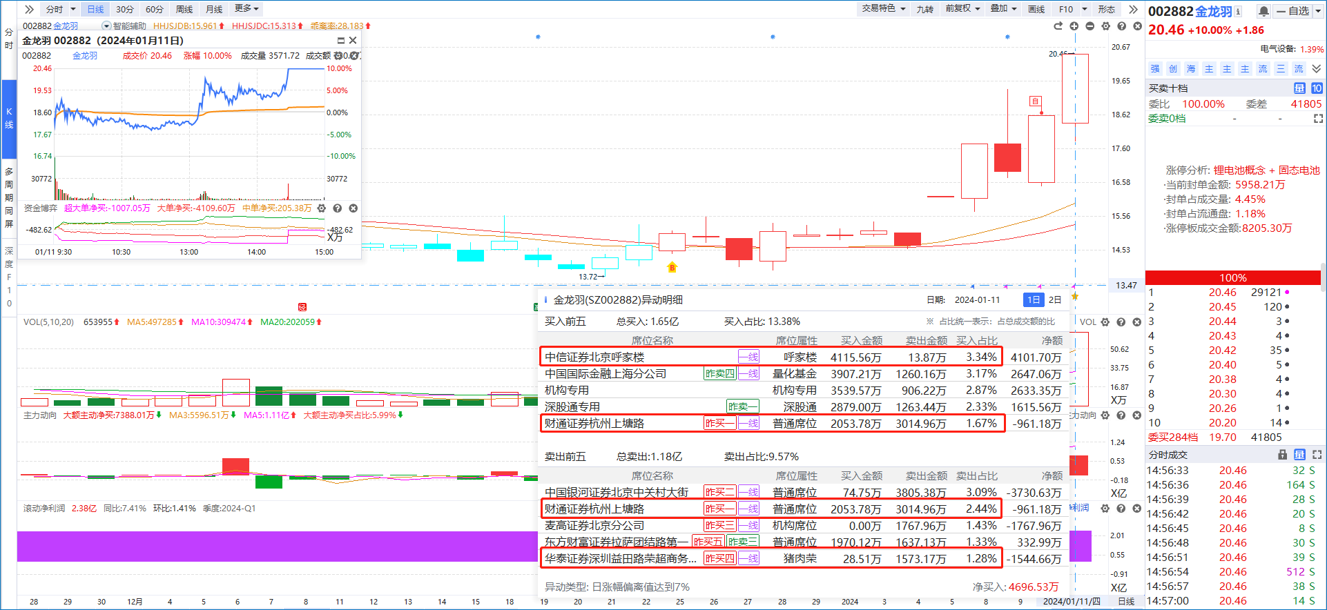 结合金龙羽的1日和2日的龙虎榜单来看,买一呼家楼买入4115万,其余买席基本是量化机构,卖一的中关村大街赚钱离场,卖二上塘路减仓做T,猪肉荣同样出货为主。金龙羽今天尾盘上班是纯粹的市场合力结果。
