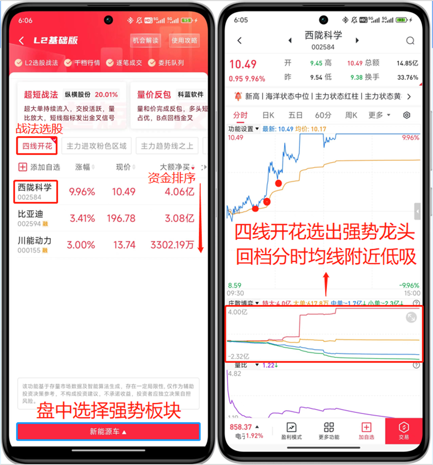 在手机上打开“L2基础版”功能,盘中选择有资金流入的板块,勾选“四线开花”就能选出强势龙头,然后按照“大额净买”进行排序,资金越多则说明主力越青睐。比如早盘老师在圈子里面让大家关注的“新能源车”板块,今天大额净买第一的西陇科学涨停,大额净买第二的比亚迪和大额净买第三的川能动力全部大涨。