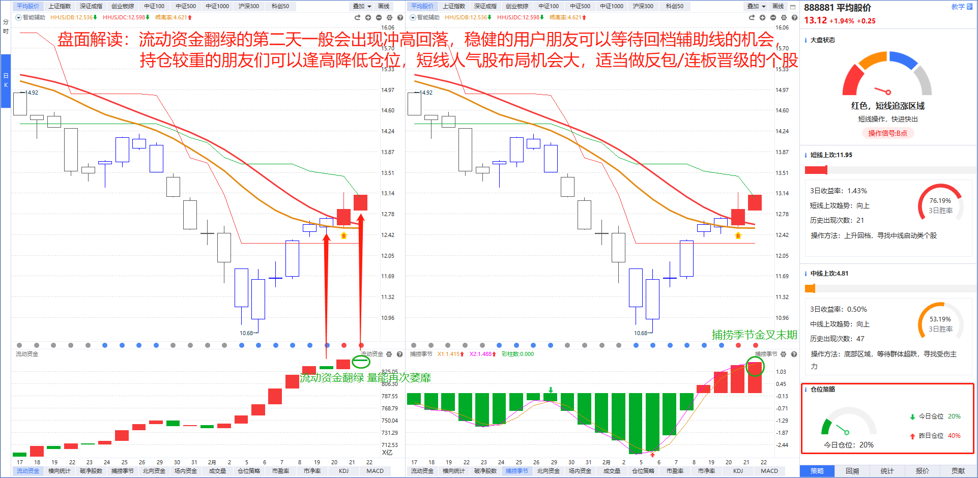 从软件指标来看,平均股价在出现B点信号后延续涨势,大盘状态进入红色的“短线追涨”区域后,短线做多情绪高涨,连板晋级/反包的成功率比较高。需要注意的是,今天的流动资金开始翻绿说明量能萎靡,并且从前天的流动资金翻绿后的表现来看,平均股价大概率低开,后续在捕捞季节即将死叉的情况下上行压力较大,仓位较重的朋友们可以适当降低仓位,等待B点回档机会更好。