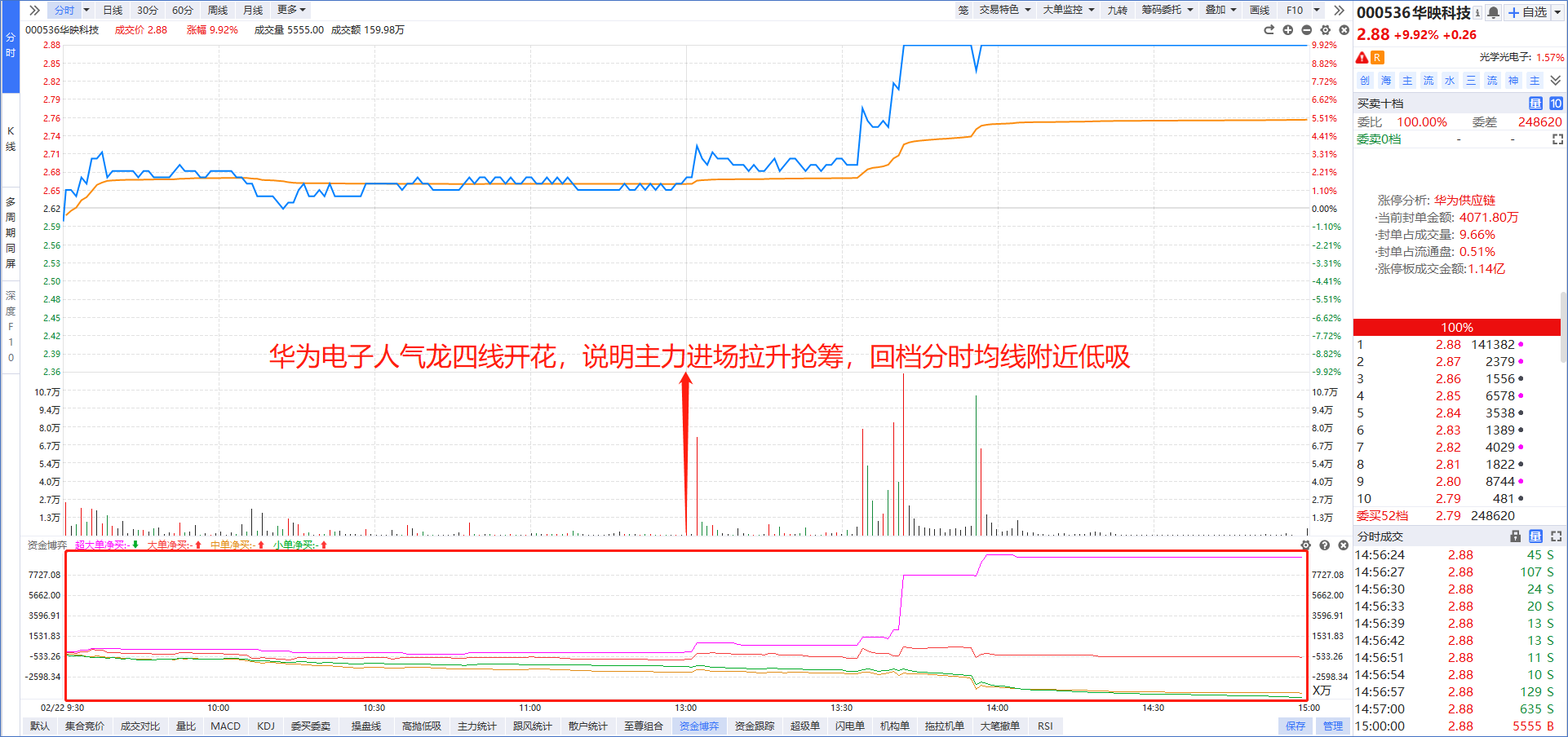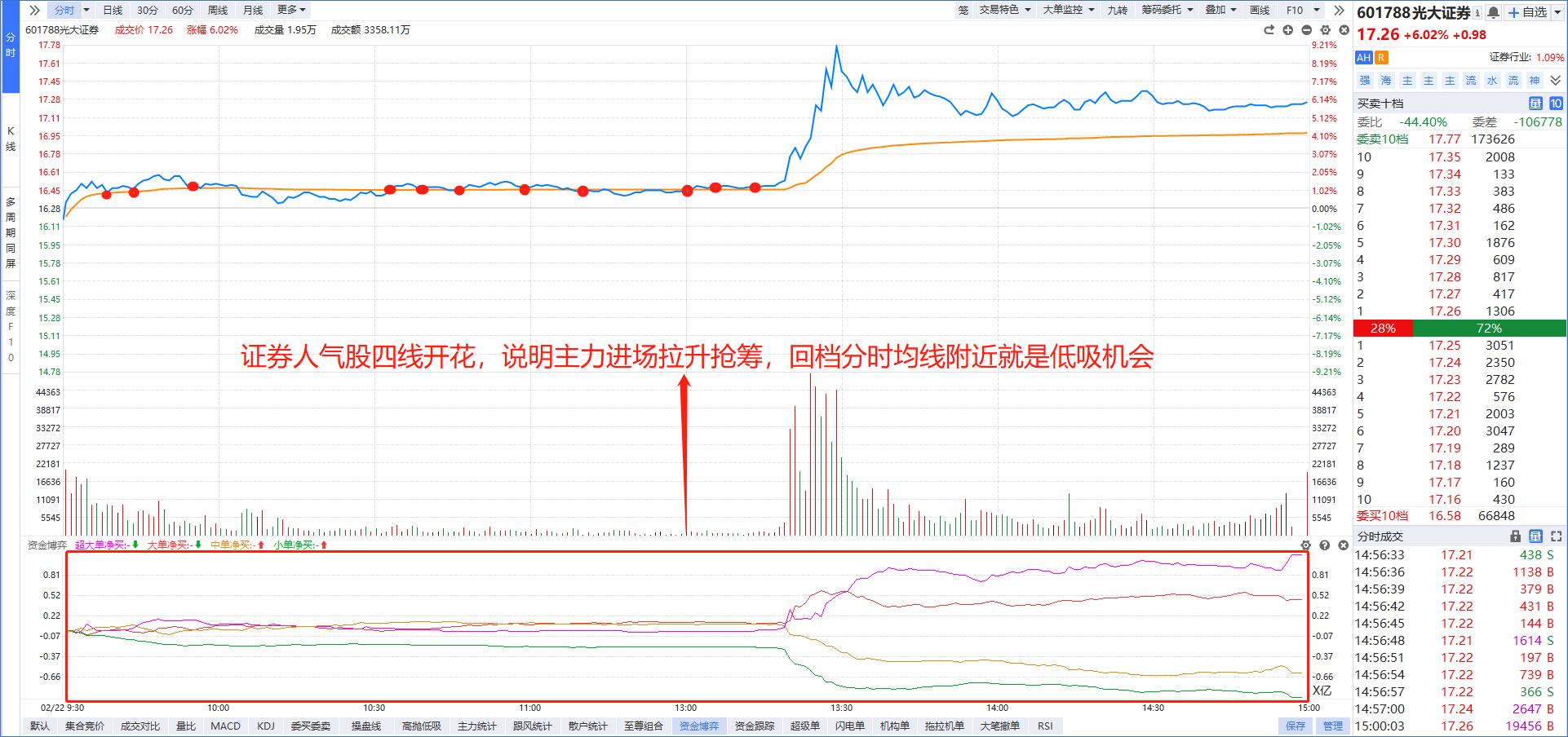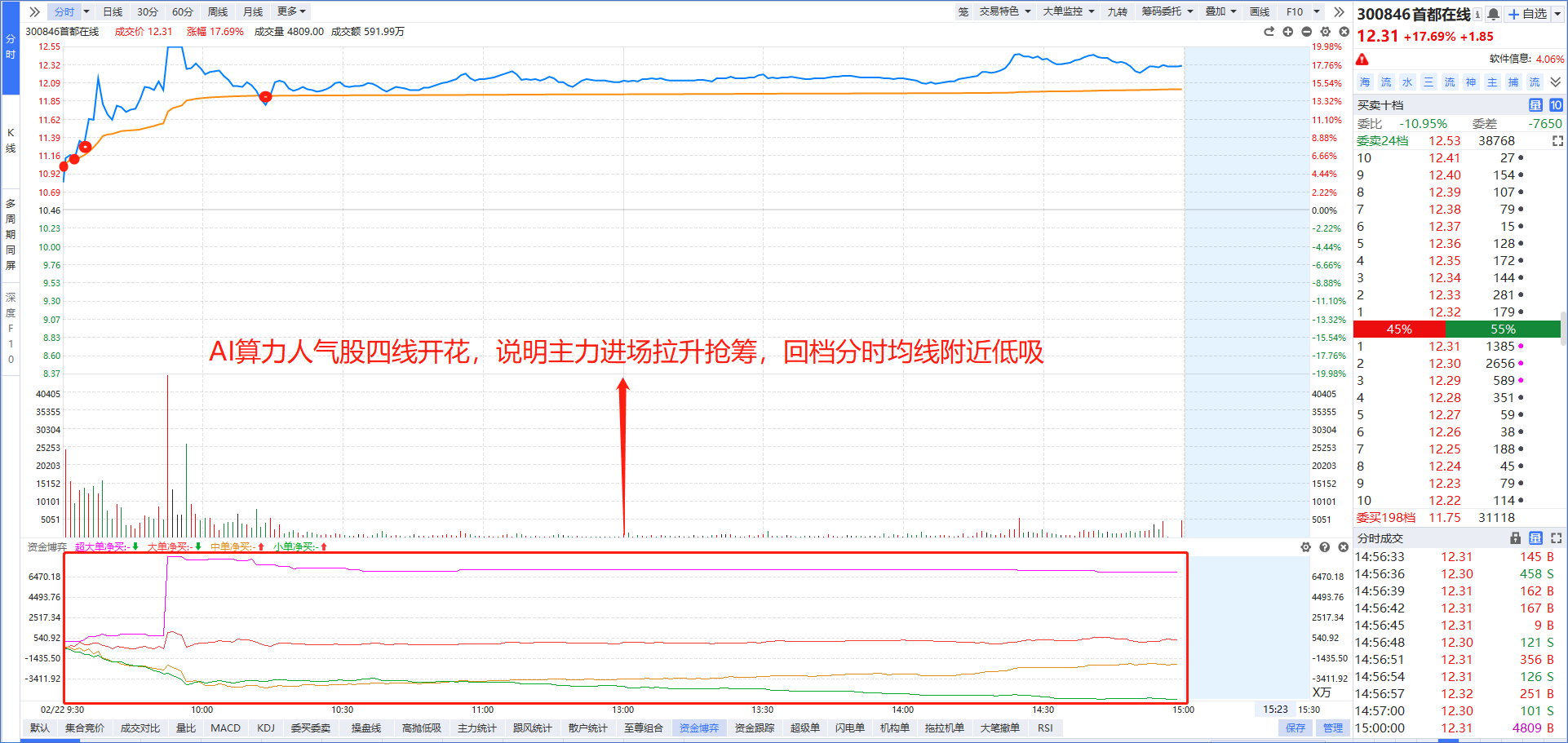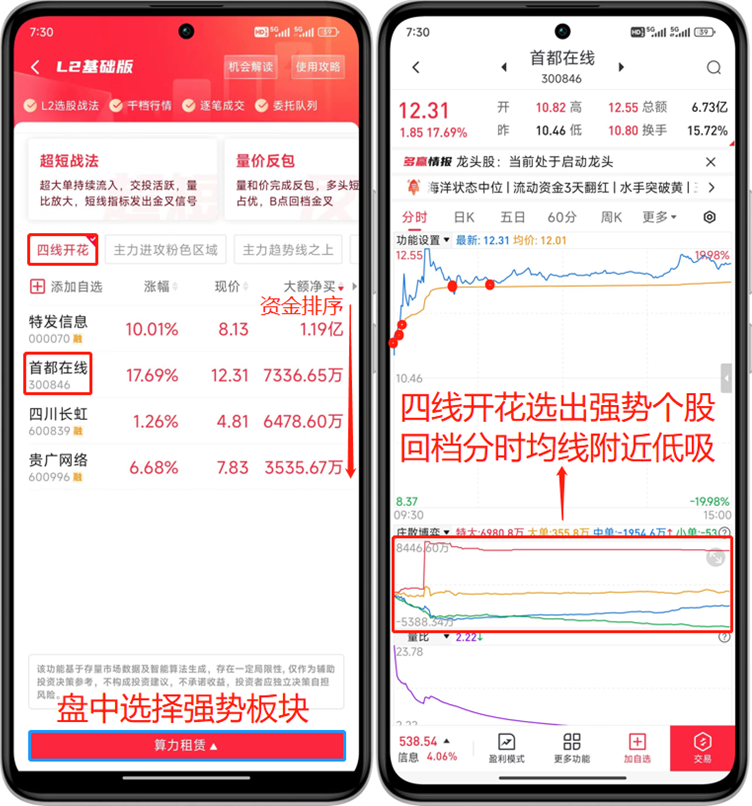在手机上打开“L2基础版”功能,盘中主力进攻的板块,勾选“四线开花”就能选出强势龙头,然后按照“大额净买”进行排序,资金越多则说明主力越青睐。比如今天早盘主力资金强势介入的算力租赁板块,大额净买第一的中银绒业强势涨停,大额净买第二的首都在线一度爆拉20cm。