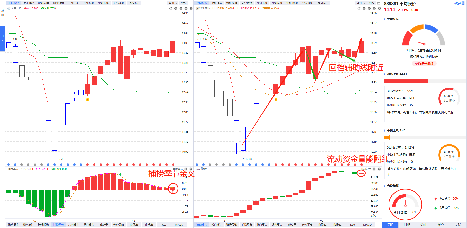 从软件信号来看,平均股价在回档智能辅助线附近后强势爆发,流动资金强势翻红(沪深两市再次突破万亿成交量)说明市场量能趋势回暖,熊线上移代表最大机会,后续在捕捞季节金叉初期可以适当加大仓位。