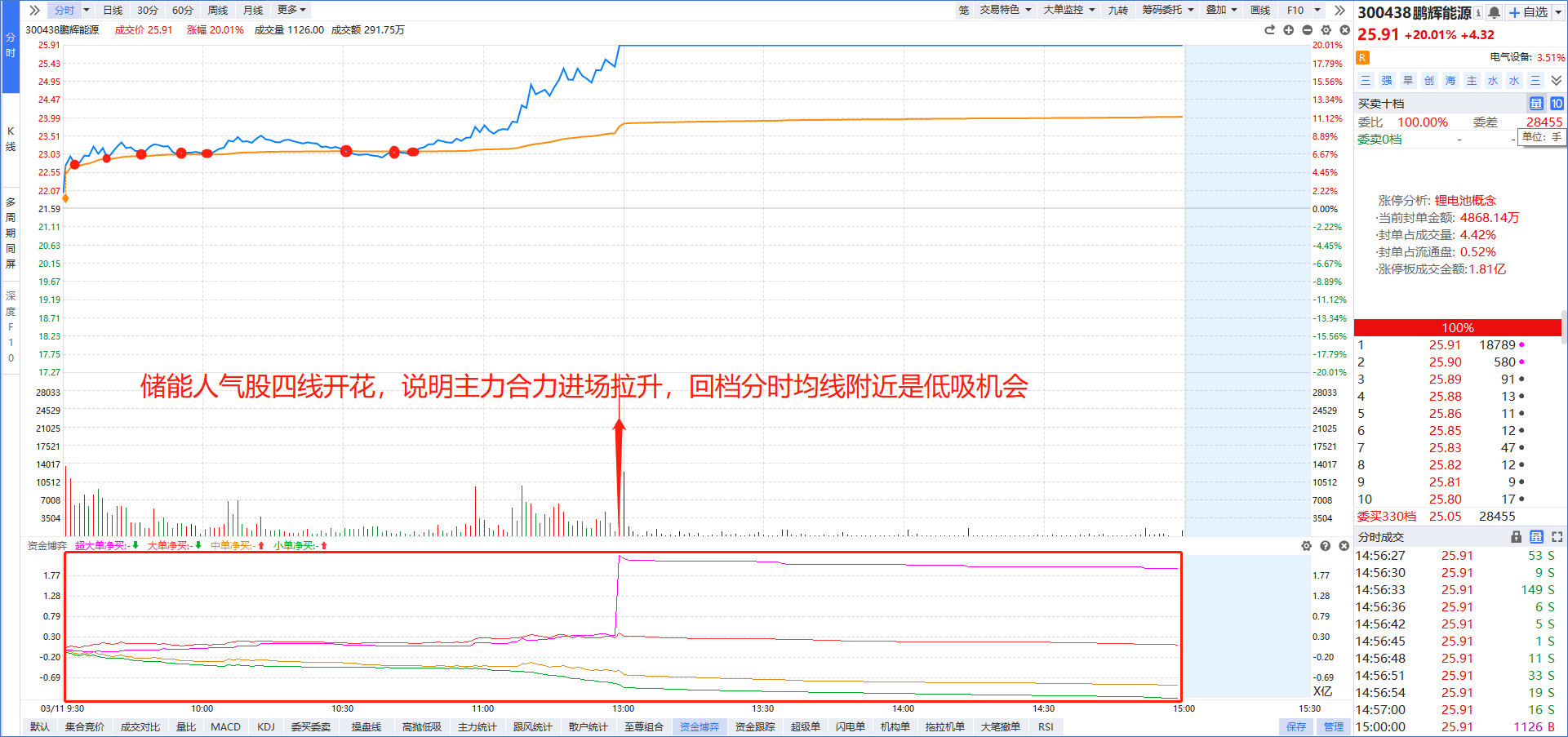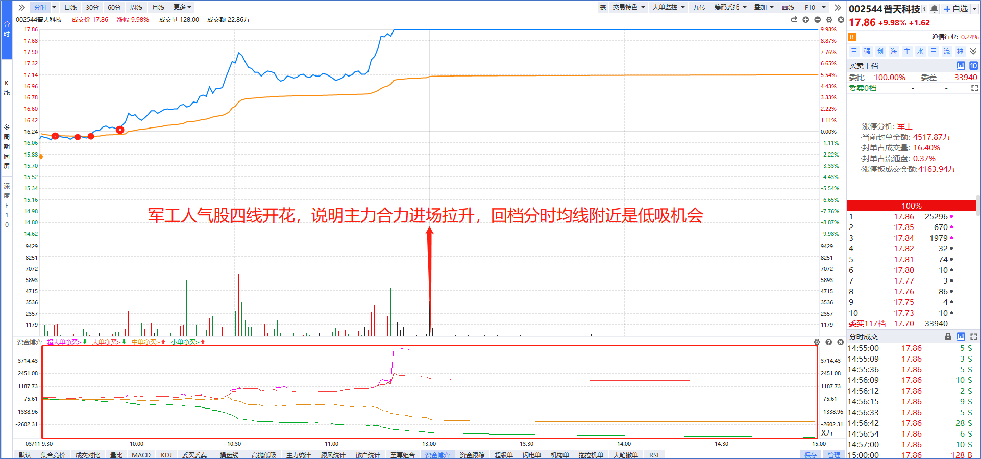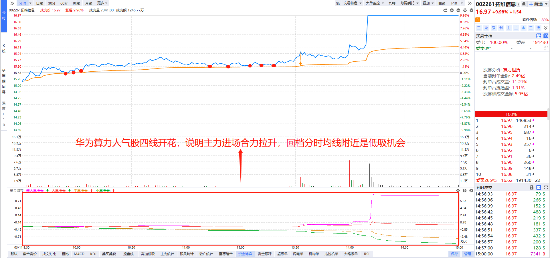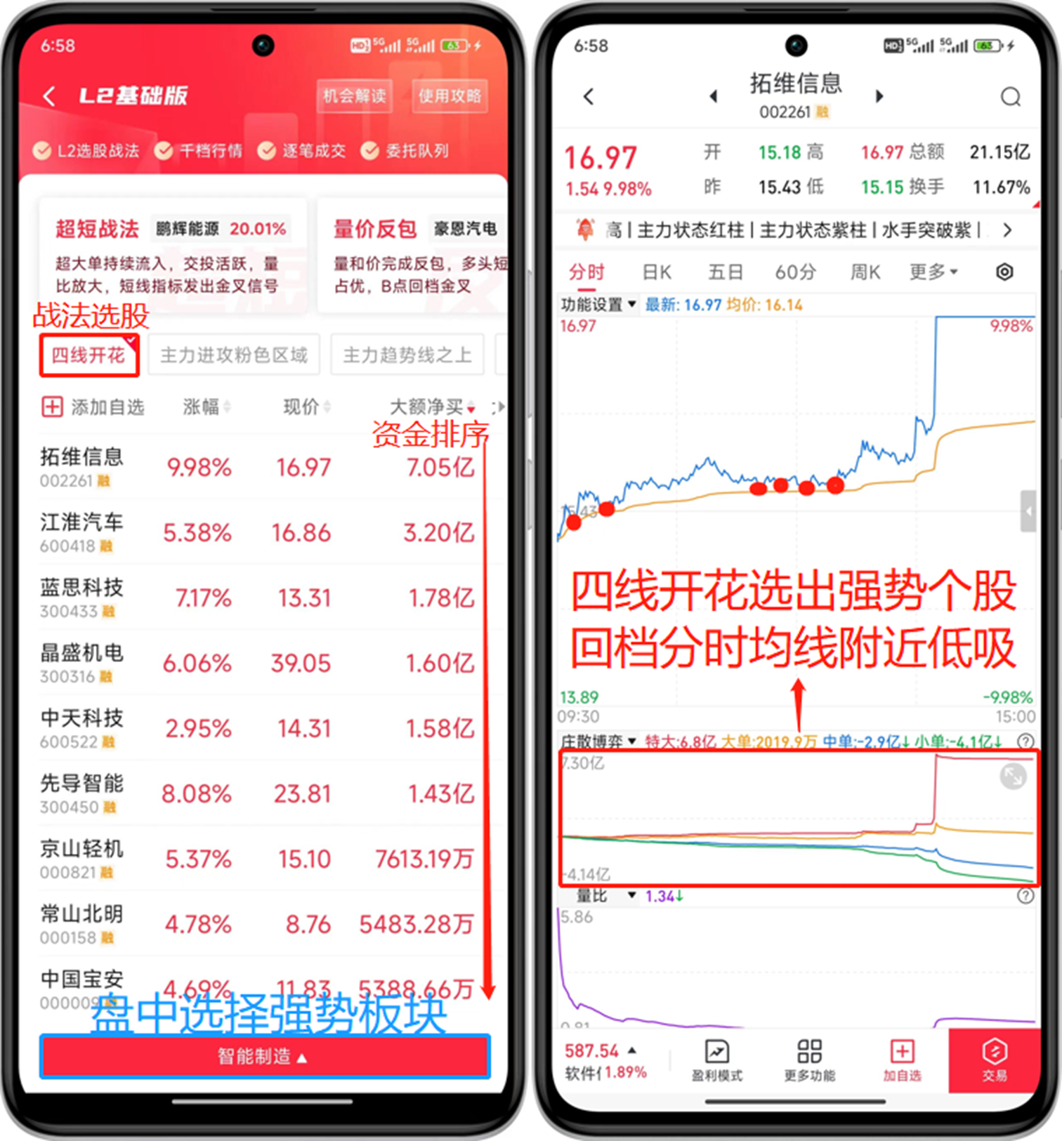 在手机上打开“L2基础版”功能,盘中选择老师看好的板块,勾选“四线开花”就能选出强势龙头,然后按照“大额净买”进行排序,资金越多则说明主力越青睐。比如今天老师提醒大家关注的智能制造概念,大额净买第一的拓维信息强势涨停。