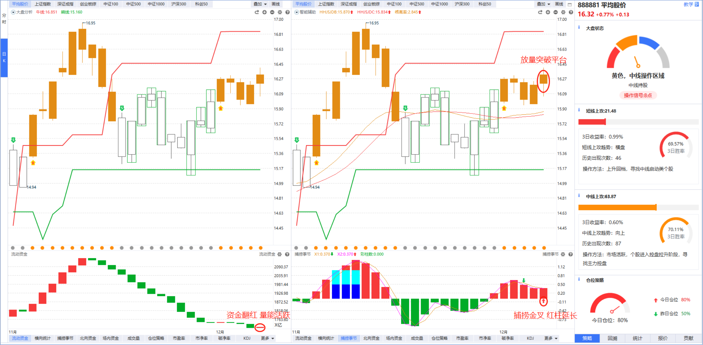 从软件指标来看,平均股价的流动资金翻红说明量能活跃,并且在捕捞季节金叉+红柱延长后直接突破箱体整理平台,在市场突破初期可以逢低做多,把仓位扩大至8层的仓位做好进攻的准备,重点关注主力控盘强者恒强个股的突破机会。