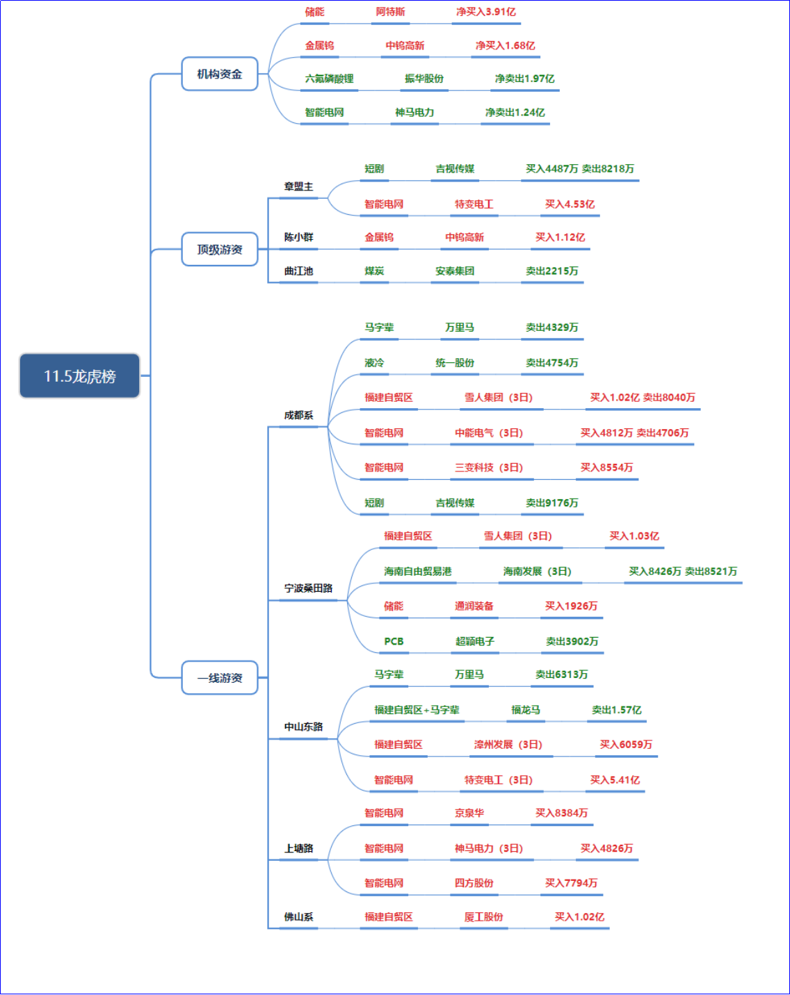 其他支线:金属钨:陈小群仅买入中钨高新1.12亿,无其他游资联动,属于个体风格的局部试错。煤炭:曲江池卖出安泰集团2215万,资金离场。液冷、PCB、马字辈、储能:成都系卖出液冷(统一股份4754万)、宁波桑田路卖出PCB(超频电子3902万)、成都系/中山东路/上塘路集体卖出马字辈(万里马、福龙马)、宁波桑田路仅小仓位买入储能(通润装备1926万),均体现支线题材缺乏资金合力,游资以止盈或小仓位试错为主。