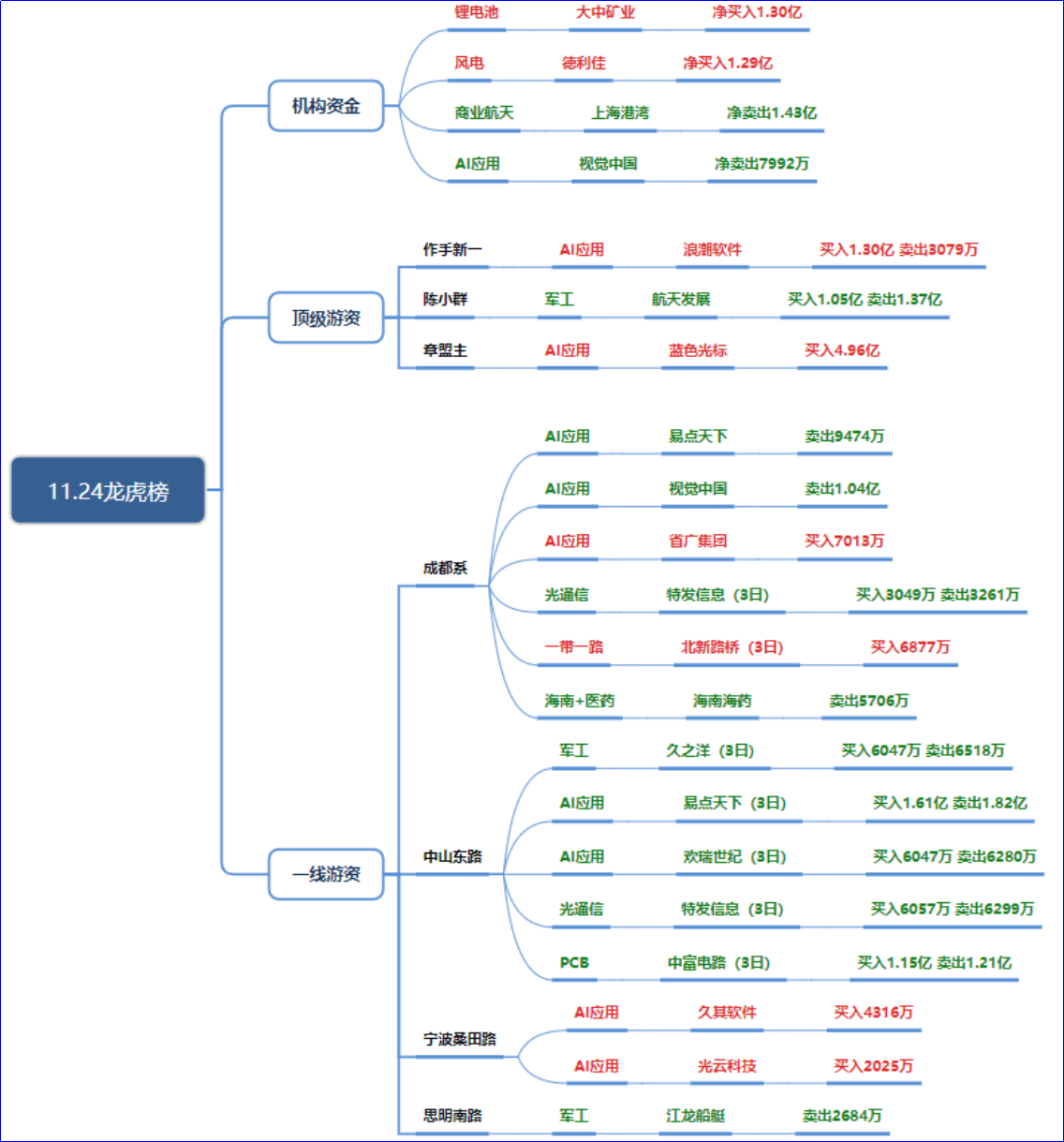 AI应用:章盟主大手笔买入蓝色光标(4.96亿),宁波桑田路买入久其软件(4316万)、光云科技(2025万),成都系买入省广集团(7013万),显示部分顶级游资仍在加码AI应用方向。空头信号--作手新一卖出浪潮软件(3079万),成都系卖出易点天下(9474万)、视觉中国(1.04亿),中山东路卖出易点天下(1.82亿)、欢瑞世纪(6280万),说明AI应用内部出现明显分化,资金在止盈老标的、布局新标的之间切换。AI应用仍是市场主线,但从普涨进入个股分化阶段。