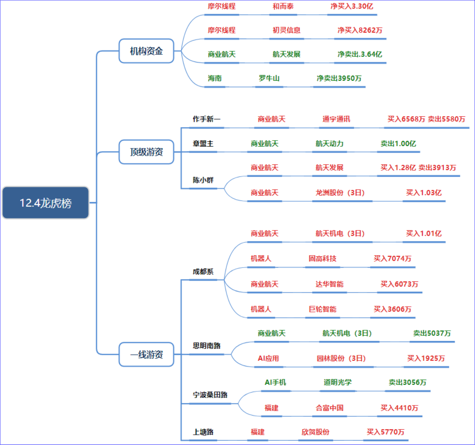 商业航天:游资扎堆介入:章盟主(卖出航天动力1亿)、陈小群(做T航天发展买入1.28亿卖出3913万、龙洲股份1.03亿)、成都系(买入航天机电1.01亿、达华智能 6073万)、作手新一(通宇通讯买卖)均布局该板块,累计投入超5亿。既有陈小群、成都系的大笔买入,也有章盟主、思明南路的卖出(如思明南路卖出航天机电5037万)。说明板块处于高波动的博弈阶段,短期涨幅过高出现获利盘兑现。