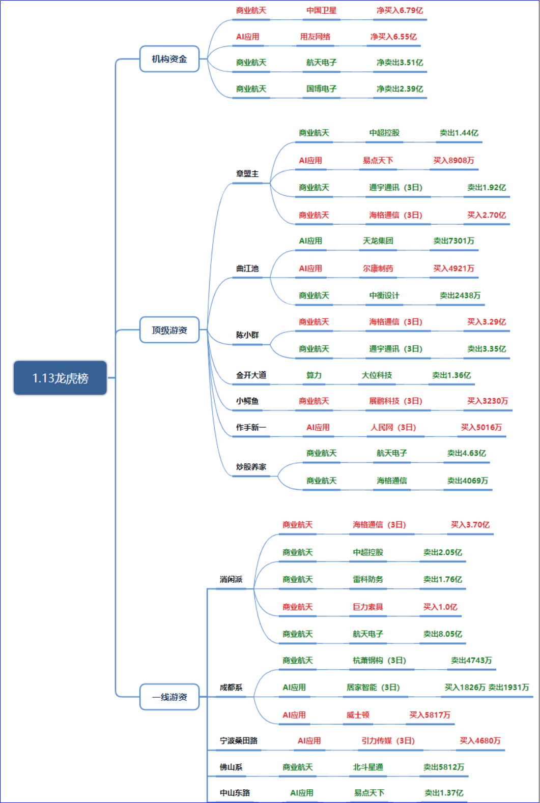 商业航天:买入端--海格通信(章盟主2.7亿、陈小群3.29亿、消闲派3.7亿)、巨力索具(消闲派1亿)等获大额买入;卖出端--中超控股、航天电子等也出现亿级卖出。商业航天是当前热钱最多的方向,板块内部已出现分歧,属于热度高但资金开始分化的阶段。