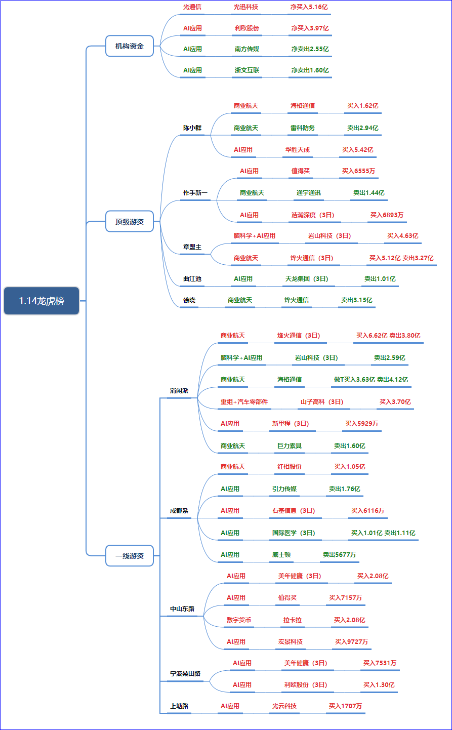 商业航天:陈小群、作手新一、章盟主、消闲派、徐晓等均参与,但买卖分歧明显,买入--章盟主买烽火通信5.12亿、消闲派买烽火通信6.62亿、红相股份1.05亿;卖出--陈小群卖雷科防务2.94亿、作手新一卖通宇通讯1.44亿、徐晓卖烽火通信3.15亿。商业航天是高波动的活跃板块,但游资有人买、有人卖,分歧大于AI应用。