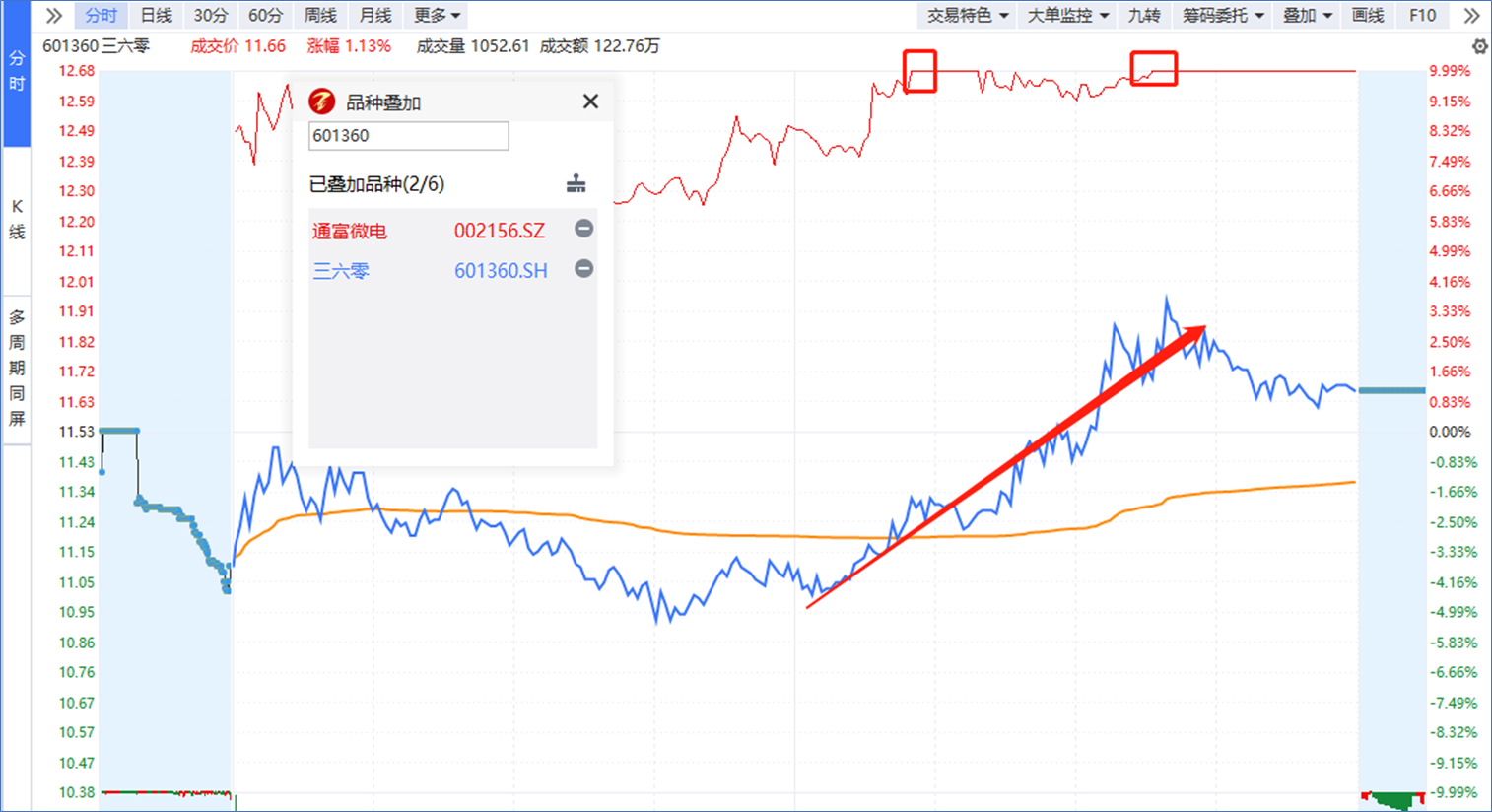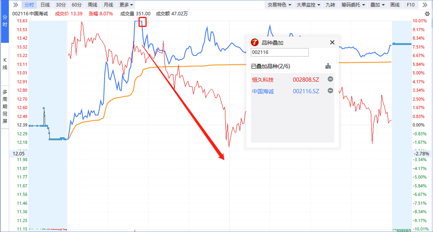后续随着中字头冲高回落,以贵州茅台为首的蓝筹权重高开低走,市场出现一波回落,三大指数集体翻绿,中国海诚(军工+中字头)开板回落,恒久科技翻绿。