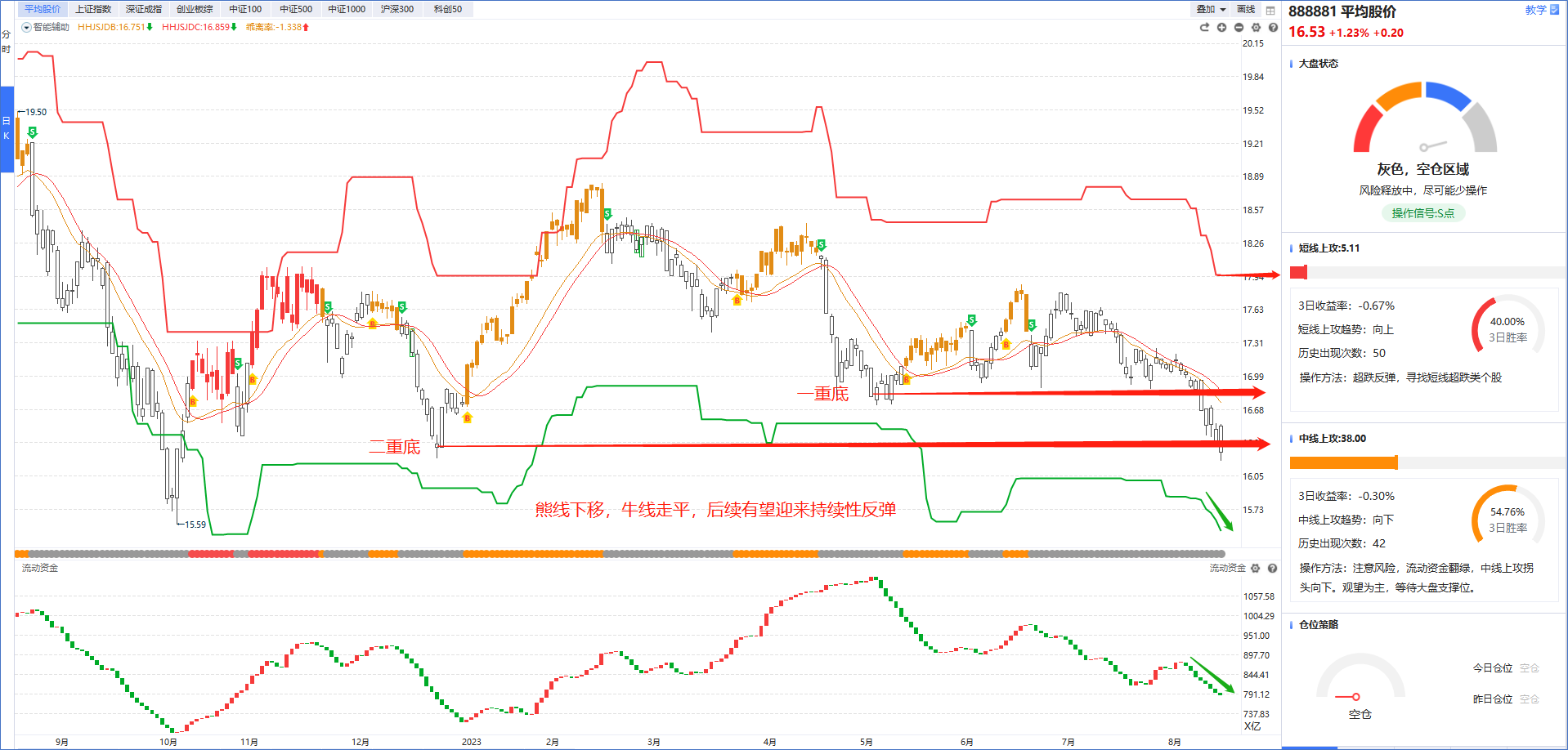 从大盘状态的平均股价来看,今天平均股价在触及“二重底”后如期迎来“大阳线”修复,在“熊线下移,牛线走平”的情况下,后续市场有望迎来持续性的反弹行情,但是在没有出现反转信号(流动资金翻红+牛线持续走平)之前不要急于抄底,先让子弹飞一会。