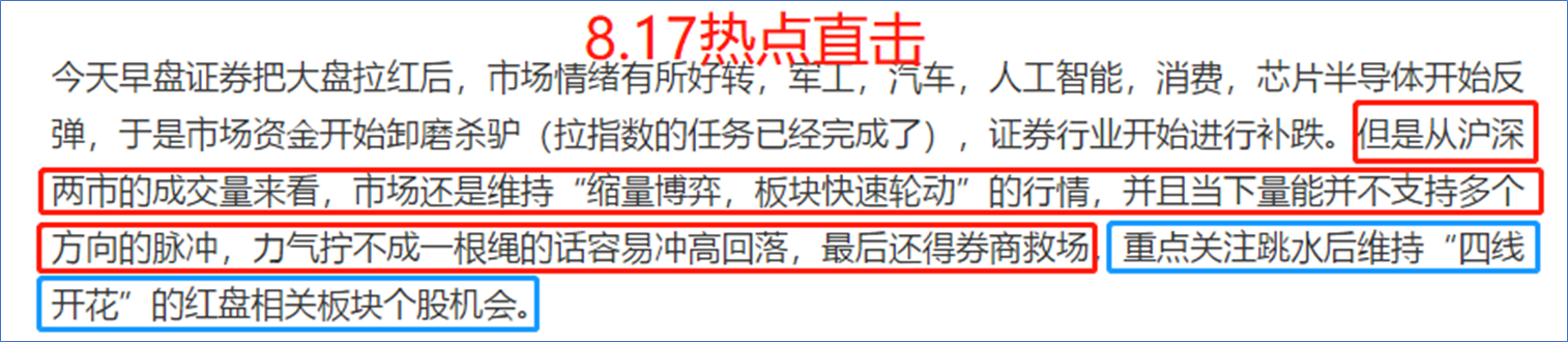 在市场没有放量之前,市场想要企稳必须过“券商”这一关。明天还是一样的策略,在“日内龙“国盛金控”不被核按钮,绝代双骄的首创证券和太平洋均维持“±3%”的状态”情况下,有持仓的用户朋友们做好“早盘低吸,盘中(最好是尾盘)冲高卖出”的做T策略就行,没有持仓的用户朋友们重点关注谁能率先出现“四线开花”就可以在回档分时均线的时候低吸。
