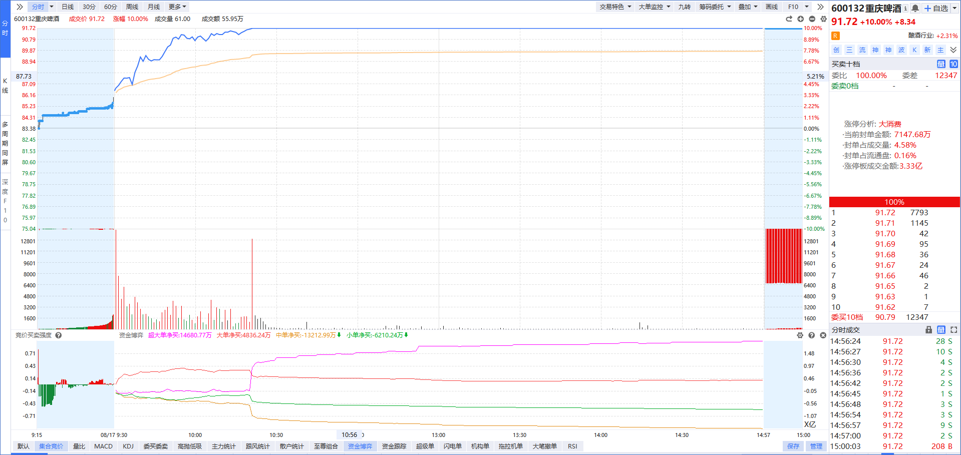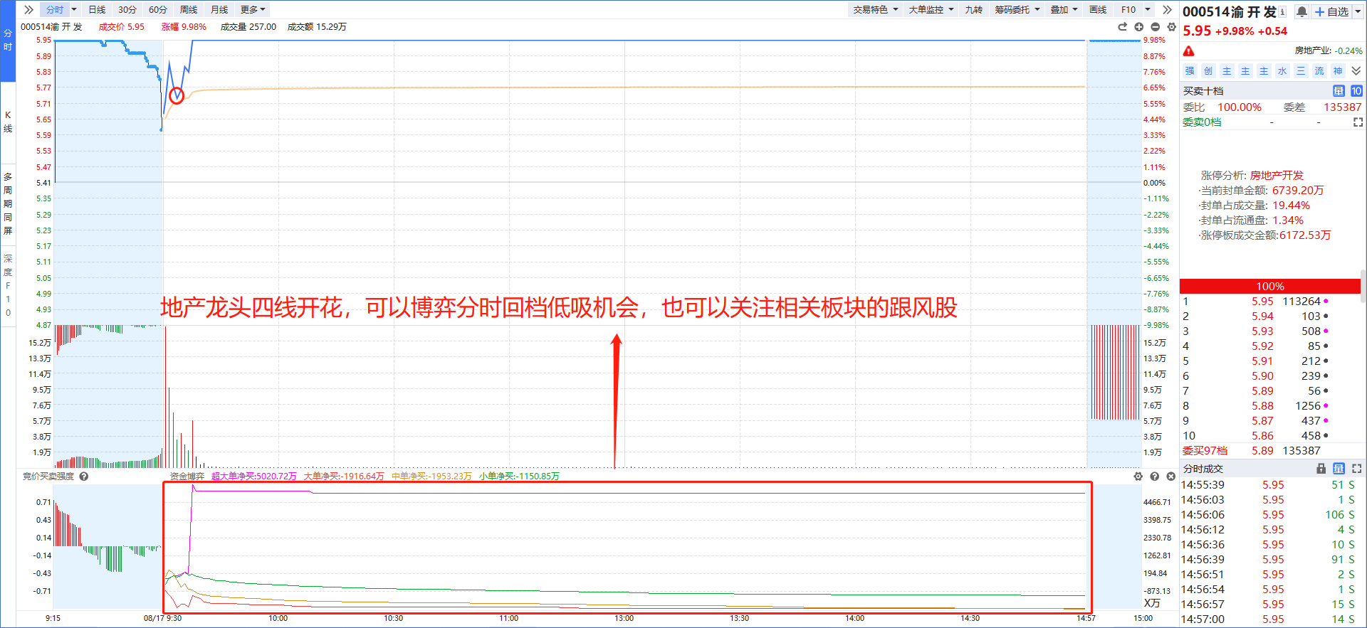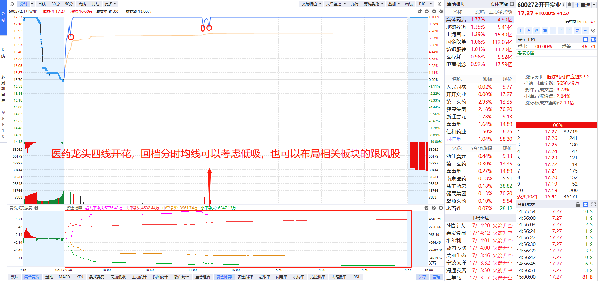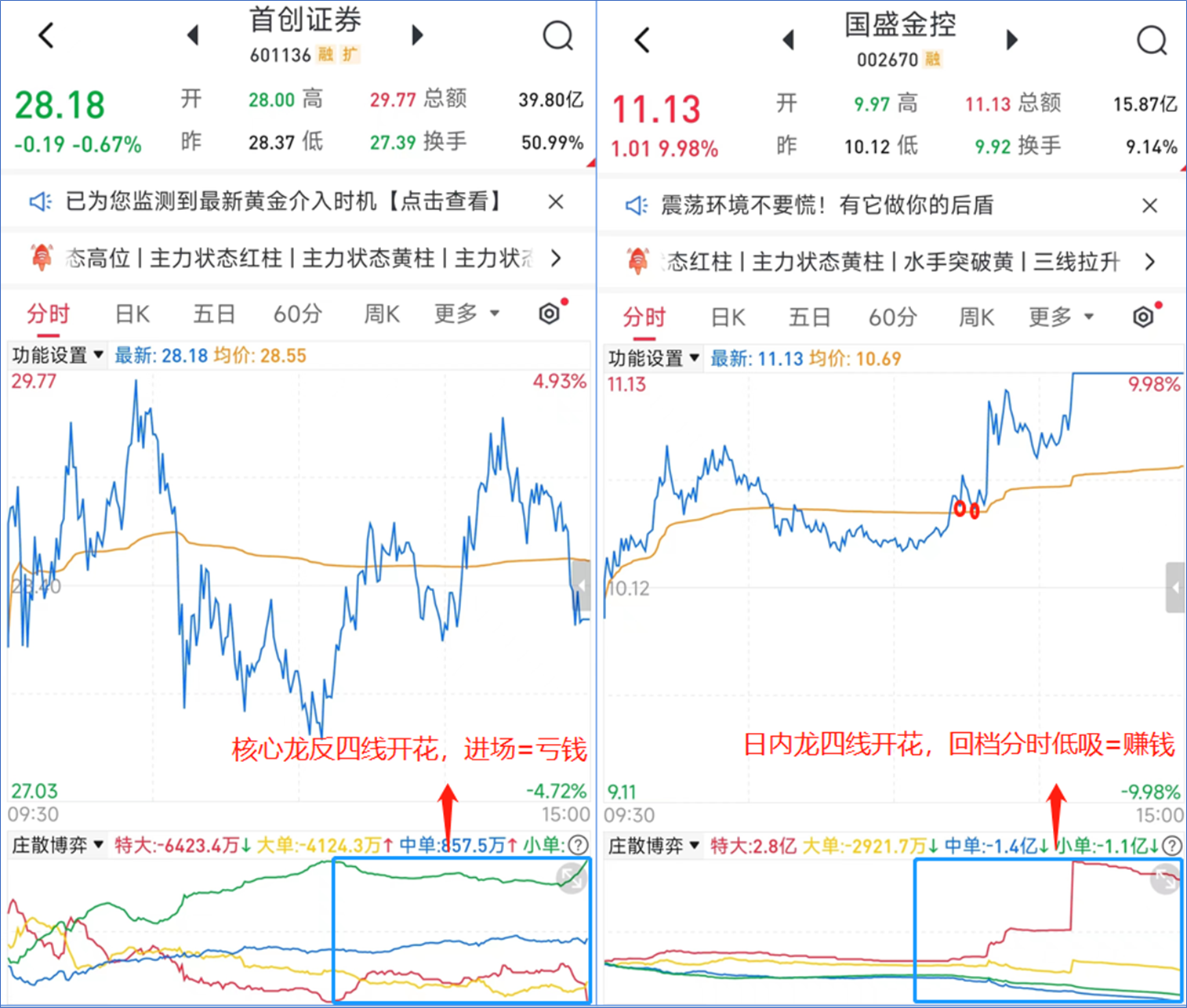 日内龙的“国盛金控”在今天拉升的时候,是特大单一直在买入,并且出现“四线开花”说明是主力使用真金白银在拉升股价,封单意愿更强,所以回档分时均线就是低吸机会;