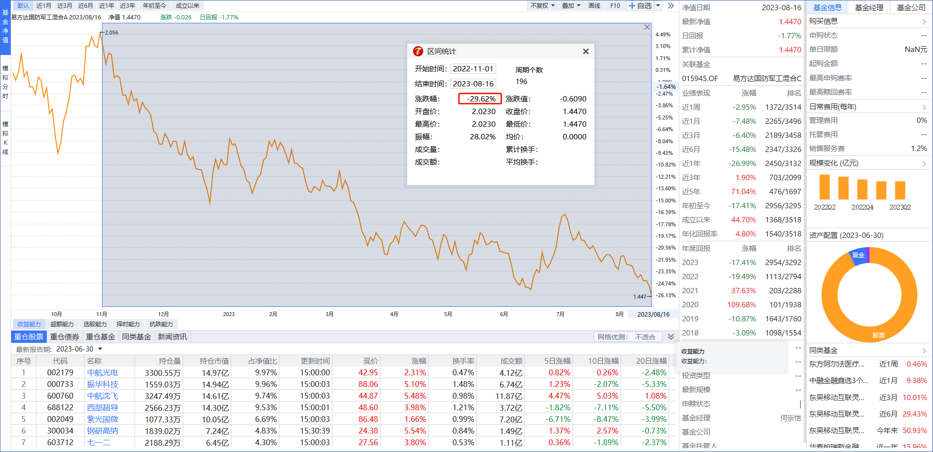 今天大家都把军工的异动是由于“朝鲜核武”的消息刺激,而老师理解为是超跌反弹。大家可以打开军工相关的基金,其持仓股今年以来基本没有反弹并且持续创新低中。目前市场炒作“低位超跌”逻辑,在医药承压后,其余小弟必然要“登台唱戏”。目前市场上的任务是拉指数,军工反弹对于指数的作用不大,所以没有太大的参与价值。
