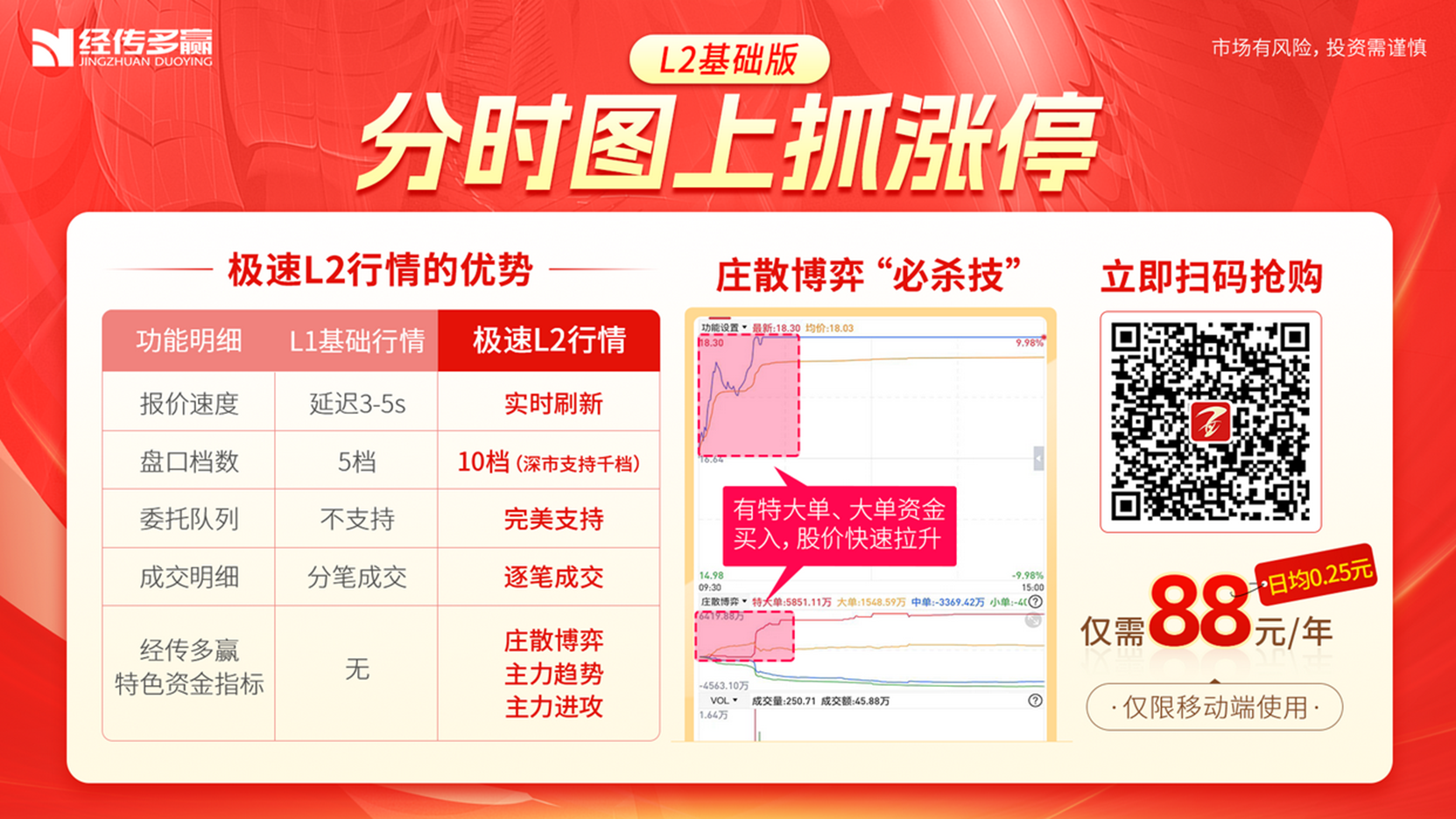 这个“庄散博弈”的功能是我们L2基础版的核心功能之一。现在仅仅需要88元即可使用一年的时间,相当于每天只需要0.25元便可知道老师当天预判出来的板块,哪些个股才是真正值得参与的,而哪些个股是“天坑”,是一个辨别好股和坏股的“照妖镜”,现在扫描二维码或者点击链接即可购买。
