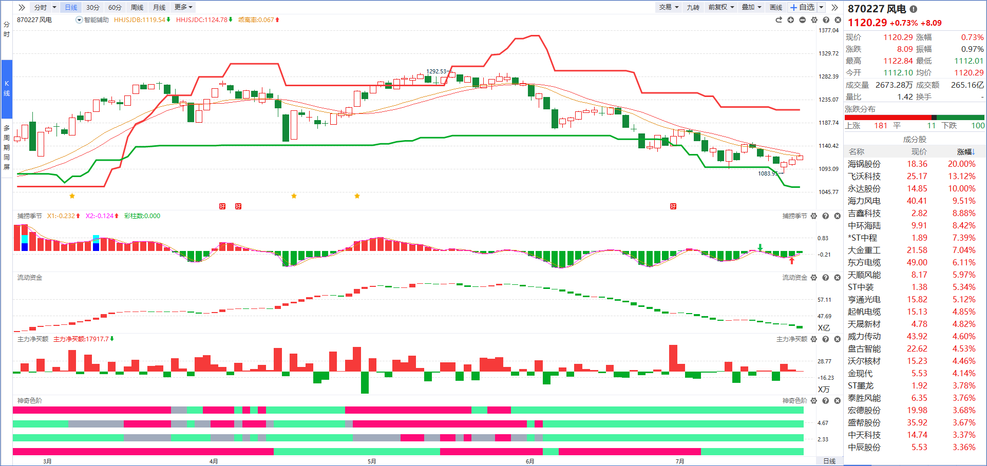 从软件指标来看,风电概念今天在消息利好下出现异动拉升,但代表短中长期趋势的神奇色阶第一、第二和第三色阶长绿说明短中长期趋势不好,并且流动资金持续翻红+主力净买额也没有出现红肥绿瘦说明主力资金进场不足,谨慎观望为主。