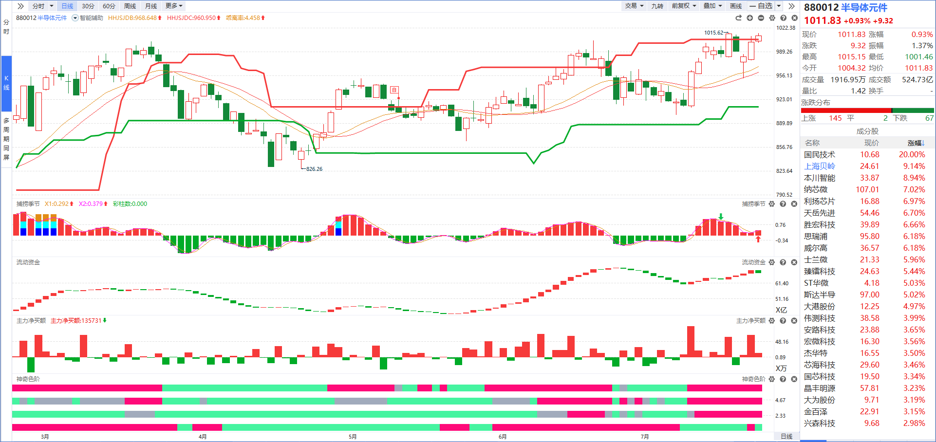 半导体元件在回档智能辅助线后持续拉升,目前主力净买额红肥绿瘦+流动资金持续翻红说明主力资金进场承接,代表短中长期趋势的神奇色阶第一、第二和第三色阶长红则说明短中长期趋势向好,但今日累计涨幅过大并且触及前期高位,有持仓的朋友可以冲高适当降低仓位。