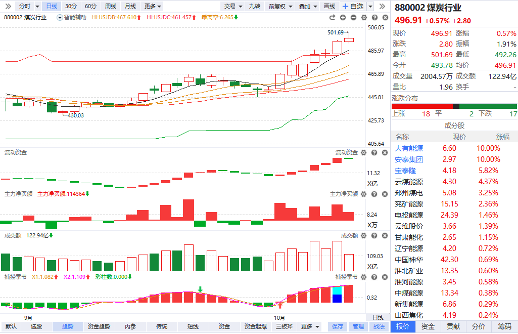 煤炭板块延续强势,大有能源6天5板,宝泰隆、郑州煤电、云煤能源、中煤能源、山煤国际跟涨。
