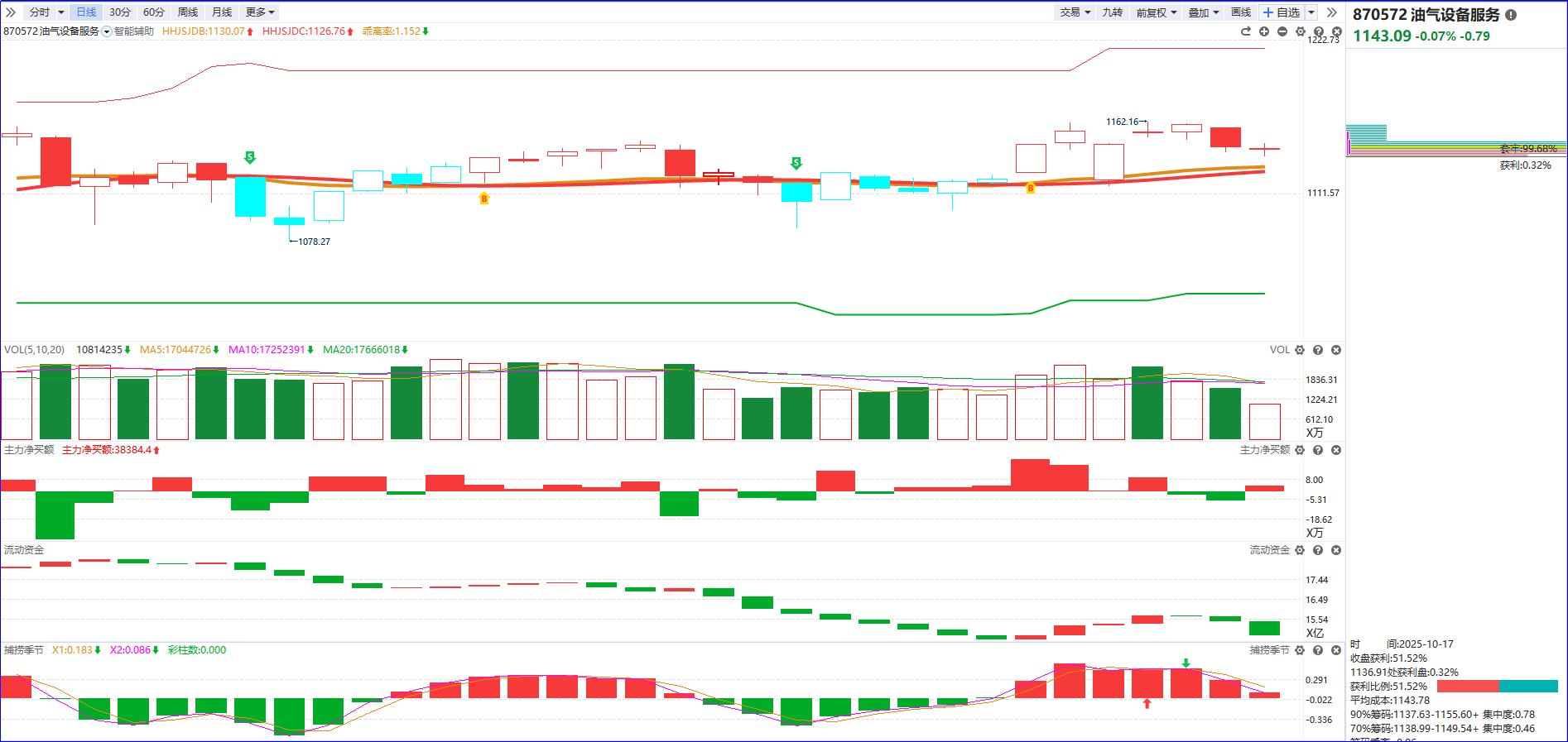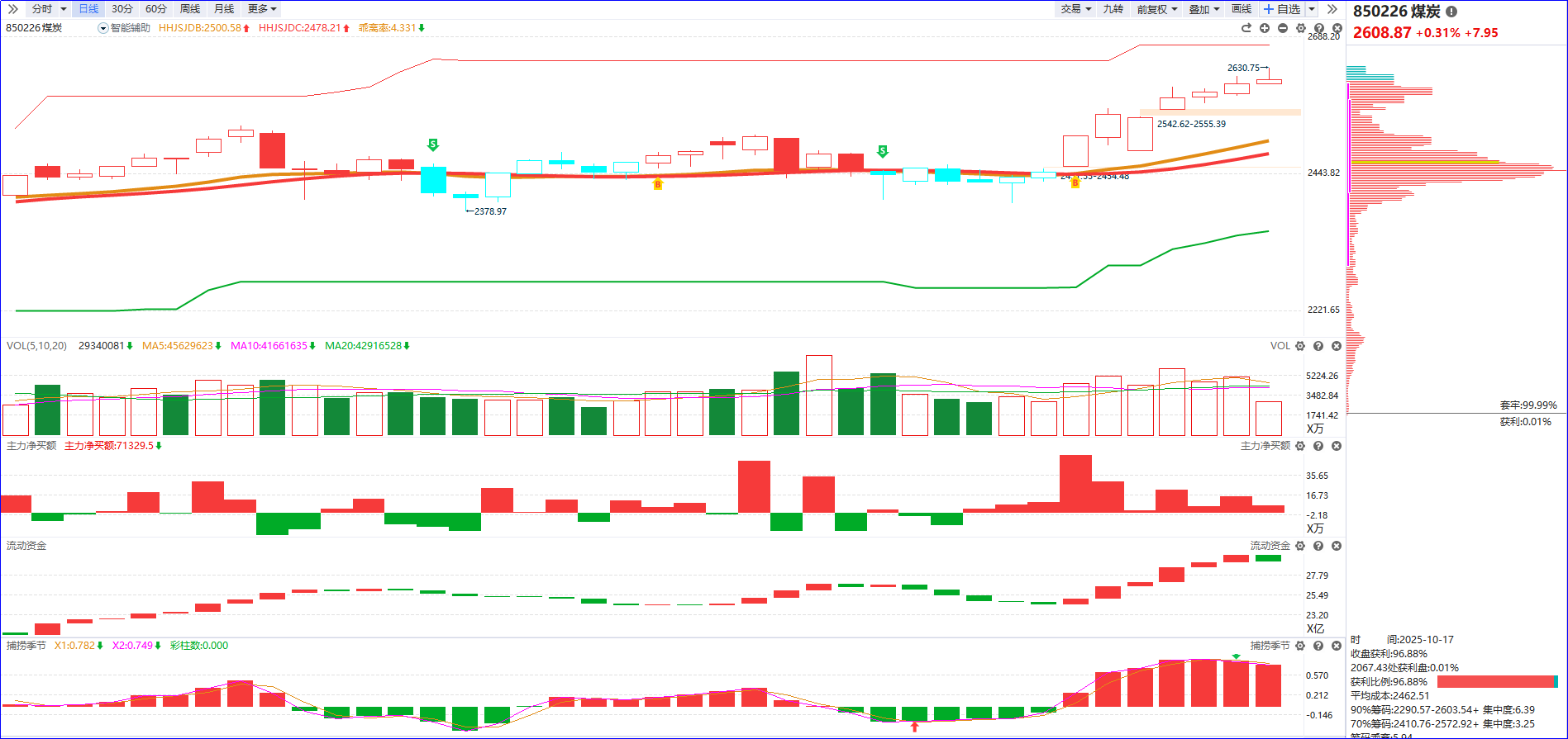 从软件信号看,煤炭板块近期呈现显著的资金强势特征:流动资金持续翻红,意味着市场活性不断提升;主力净买额呈现红肥绿瘦,表明主力资金整体以净流入为主,做多意愿明确。在此支撑下,板块股价走出沿5日均线震荡上行的强势趋势,且已连续多个交易日处于捕捞季节金叉反弹周期,技术面多头结构稳固。不过,今日板块出现冲高回落的震荡走势,需警惕短期动能变化。若后续行情连续进入滞涨状态,需重点关注捕捞季节出现死叉的风险信号。值得注意的是,当前板块仍处于资金强势的大背景下,即便出现首次死叉引发的回档,从短线维度看,仍具备一定的反弹预期,可视为趋势中的阶段性调整机会。