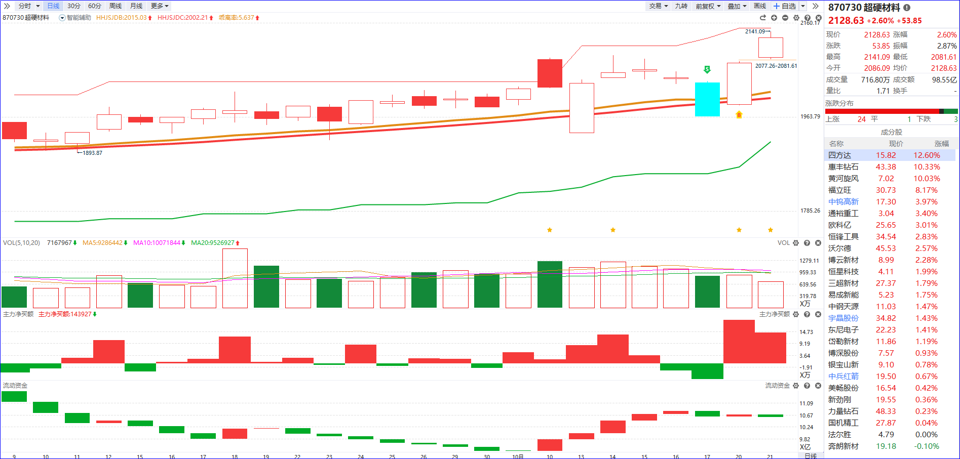 从软件信号看,超硬材料板块近期呈现积极信号:流动资金由净流出转为持续净流入,主力净买额同样保持红肥绿瘦的正向格局,资金面支撑力度逐步增强。技术面上,放量突破前期横盘整理平台,形态上完成由弱转强的关键切换。若后续资金能持续流入,板块有望脱离震荡区间,形成趋势性上涨行情。当前阶段,新主题筛选可聚焦两大核心指标:一5日主力资金排序靠前(确保资金关注度),二是流动资金持续翻红(验证资金持续性);操作层面,板块内处于金叉初期、且60分钟级别出现回档的标的,具备较高的短线博弈性价比。