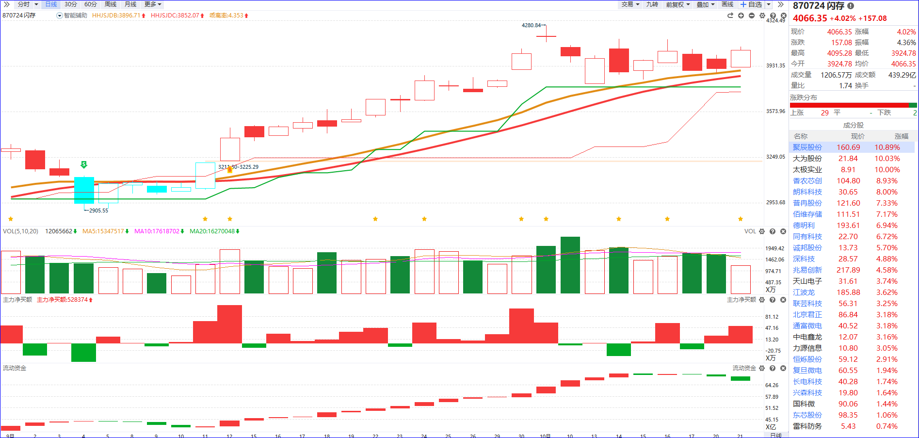 从软件信号看,近期存储芯片板块流动资金持续呈净流出态势,虽主力净买额整体呈现红肥绿瘦,但板块整体交易活跃度明显不足。从行情结构看,板块内尚未出现具备带动性的连续上涨领涨龙头,行情更多表现为内部个股轮动特征。在此格局下,需重点警惕高位追涨风险--轮动行情中个股冲高后回调概率较高,盲目追高易陷入短期套牢,需要重点挖掘板块内估值与业绩存在预期差、且短期调整充分的标的,把握低吸布局机会,避免在轮动高点介入。