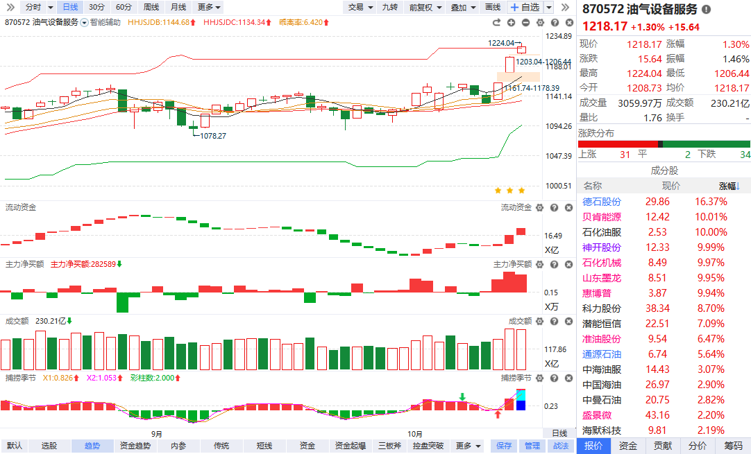 午后油气股持续拉升,贝肯能源直线涨停,潜能恒信涨超10%,惠博普、准油股份、通源石油、中曼石油等快速冲高。